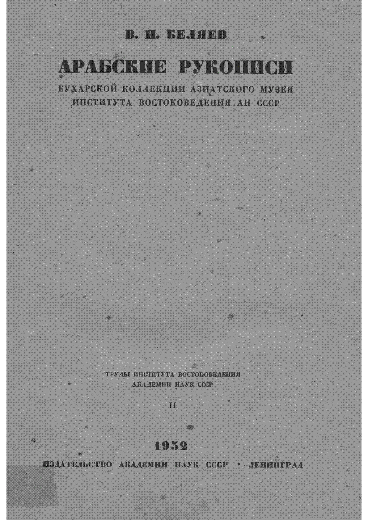 Арабские рукописи [Текст] : Бухарской коллекции Азиатского музея Института востоковедения АН СССР / В. И. Беляев ; Институт восточных рукописей (Санкт-Петербург)... – Ленинград : Издательство Академии наук СССР, 1932. - 52 с.– (Труды Института востоковедения. ; т. 2 . – Библиогр. в подстроч. примеч. . – 1000 экз.