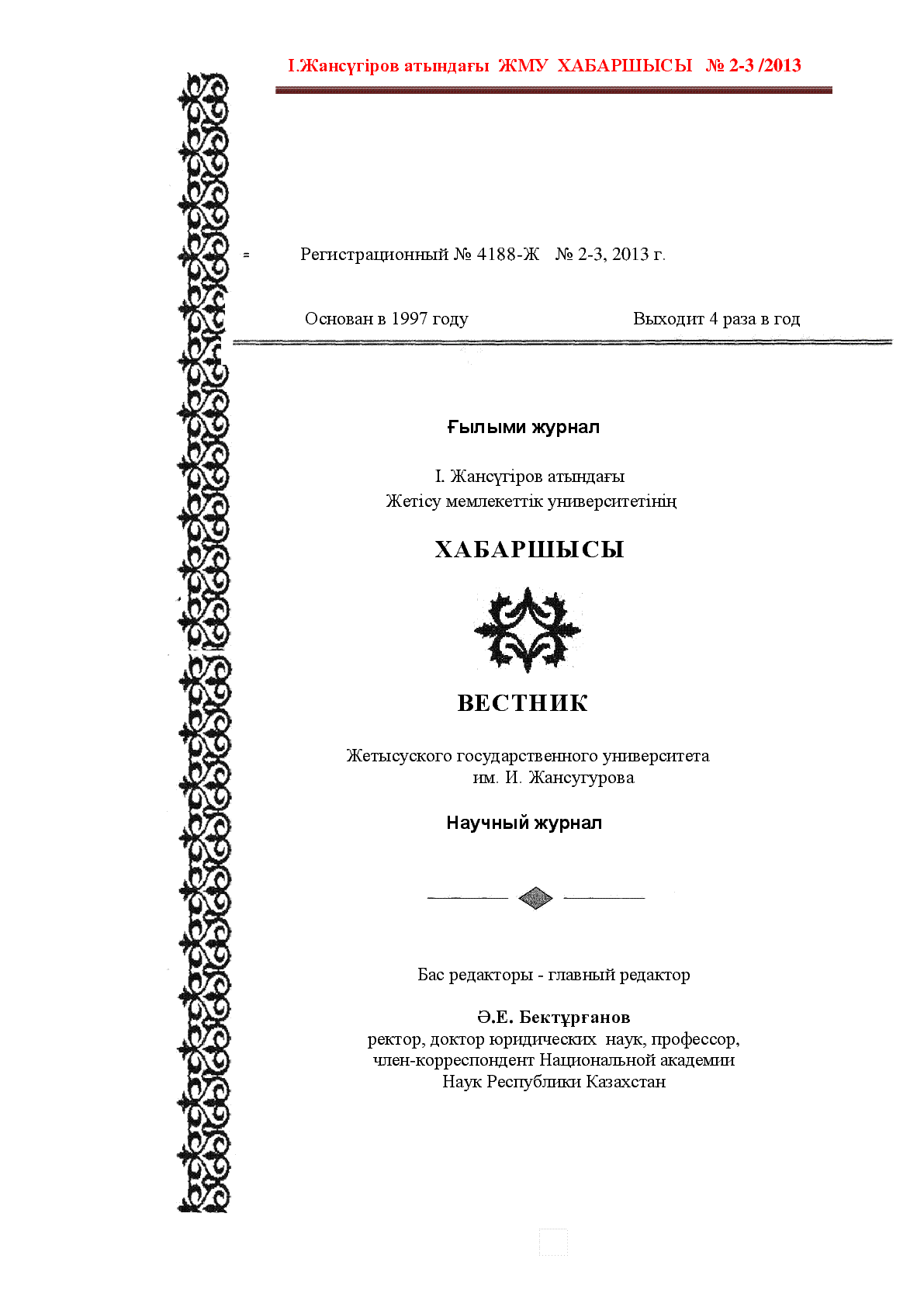 І. Жансүгіров атындағы Жетісу мемлекеттік университетінің хабаршысы = Вестник Жетысуского государственного университета им. И. Жансугурова [Text] : ғылыми журнал : 1997 жылы шыға бастады ; бас ред. Ә. Е. Бектұрғанов. – Талдықорған : [б. ж.], 2013. - .– 100 экз..– жылына төрт рет шығады. – 1813-1123. - 100 экз.