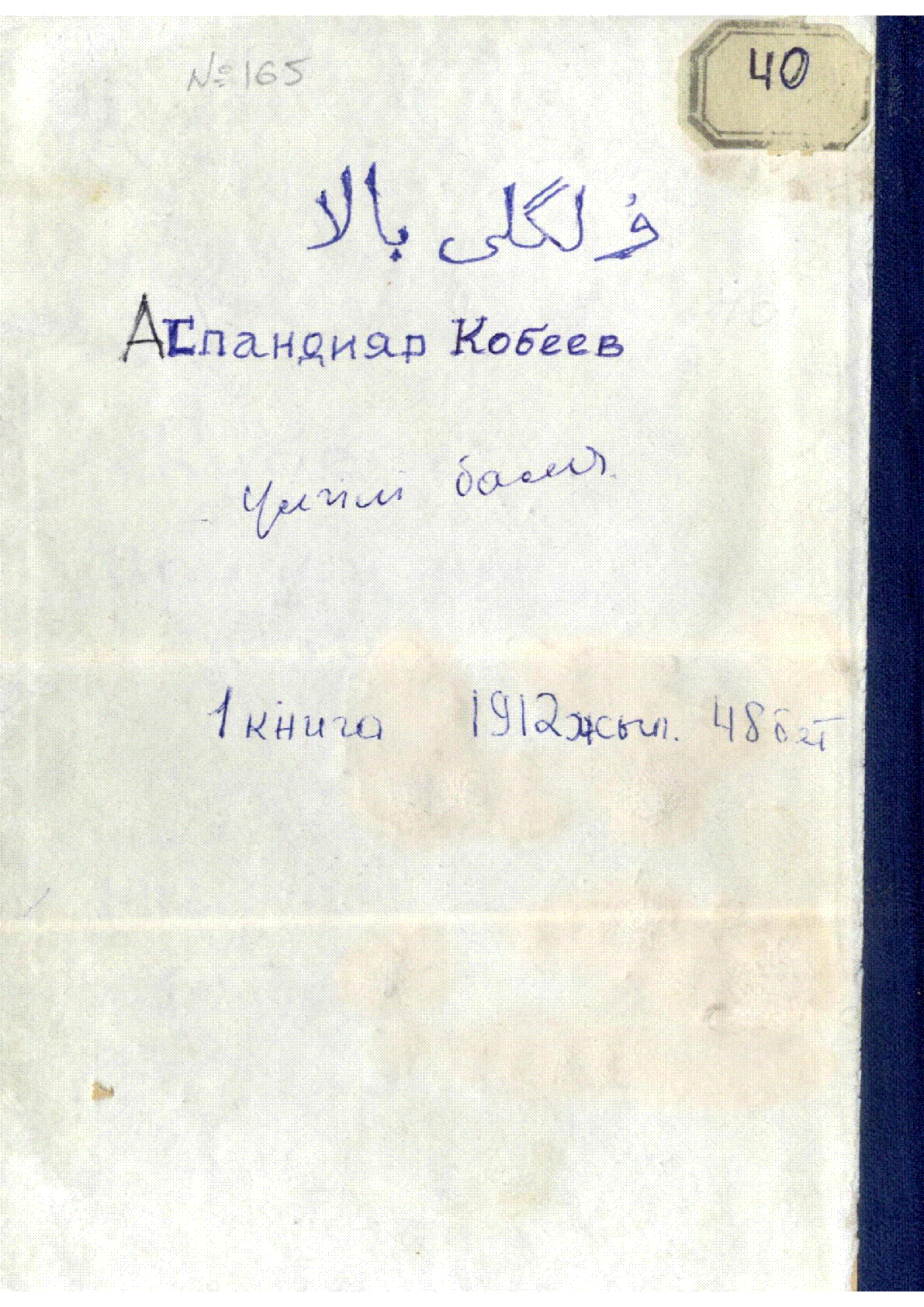 Үлгілі бала = اولگلى بالا [Мәтін] : Қазақша оқу кітабы. Мектептерде һәм үйде оқу үшін өз тілдеріндегі тәуір оқу кітаптарынан алынып қазақша жазылды / С. Көбеев ... – Қазан : Матбәға-и Каримия, 1912. - 76 б. 20,5х15 см. - Мәтін араб графикасымен жазылған, №40 - кітаптың басы (1-48 беттер) . .