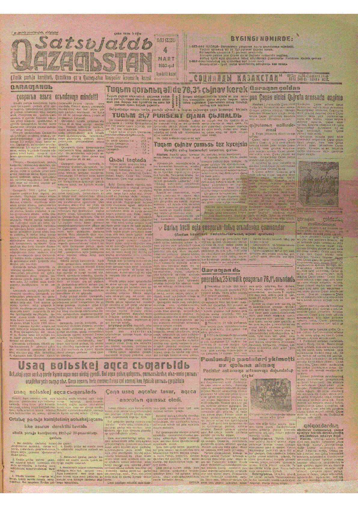 Социалды Қазақстан, 1932 ж. = Satsьjaldь Qazaqьstan : 4 март, 1932 ж.. – Алма-Ата : [Типолит-КСЦНХ], 1932. - .– [т.ж.]. № 51 (2224). - [т.ж.]