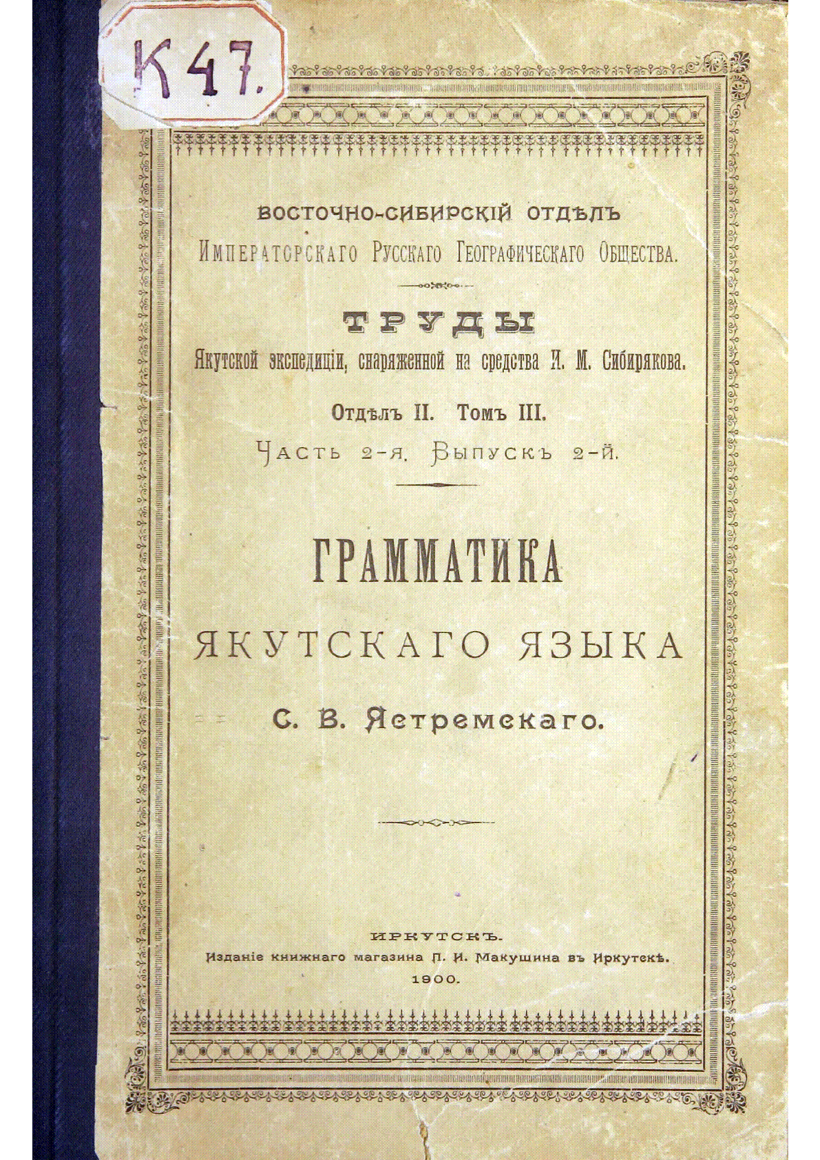 Грамматика якутского языка [Текст] / С. В. Ястремский ... – Иркутск : П. И. Макушин, 1900. - 306, [6] с.– (Труды Якутской экспедиции, снаряженной на средства И.М. Сибирякова. / Восточно-Сибирское отделение Русского географического общества. ; Отд. 2. Т. 3, ч. 2, вып. 2 . . – [б. т.]