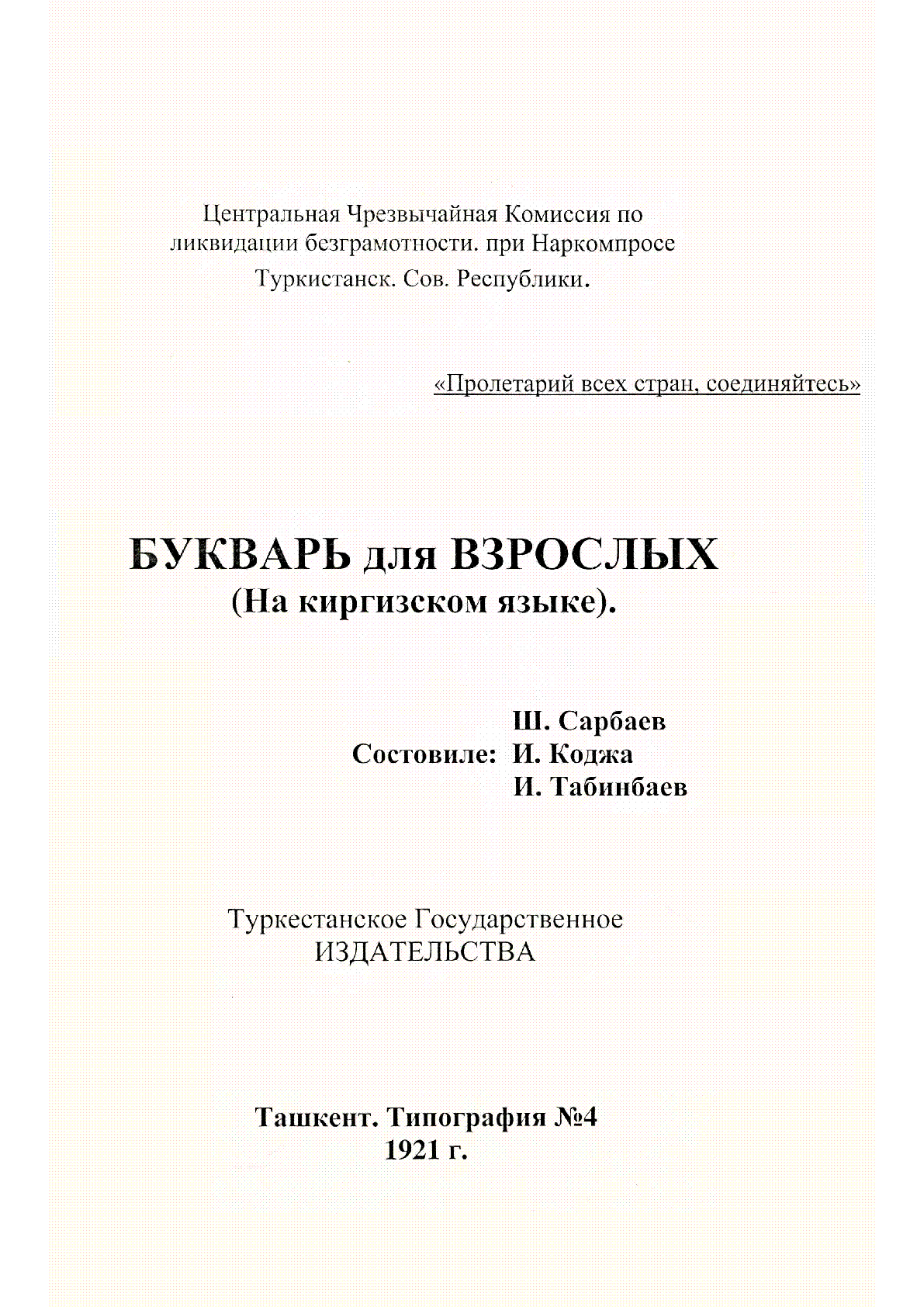 Үлкендер үшін әліппе = اولكه نده ر اوچن أليفبا [Мәтін] / ... – Ташкент : Түркстан хукумәтінің баспа сөз тарату бөлімі, 1921. - 20 б. 27 см – (Түркстан жуһриятының халық ағарту комиссариятының жанындағы сауатсыздықты жоқ қылу үшін жасалған кіндік тығыз комиссиясы. - Мәтін араб графикасымен қазақ тілінде . . – 50000 дана