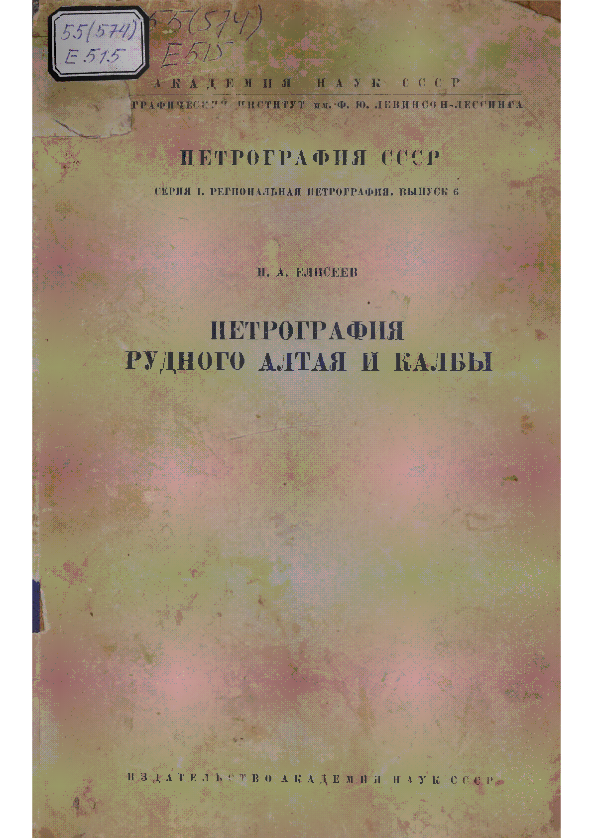 Петрография рудного Алтая и Калбы [Текст] / Н. А. Елисеев ; [отв. ред. Ф. Ю. Левинсон-Лессинг ; ред. И. И. Лебедев] ; Акад. наук СССР ; Петрогафический ин-т им. Ф. Ю. Левинсон-Лессинга... – Москва ; Ленинград : Издательство Академии наук СССР, 1938. - 245, [3] c.– (Петрография СССР. : Региональная петрография ; Вып. 6 . . – 1250 экз.