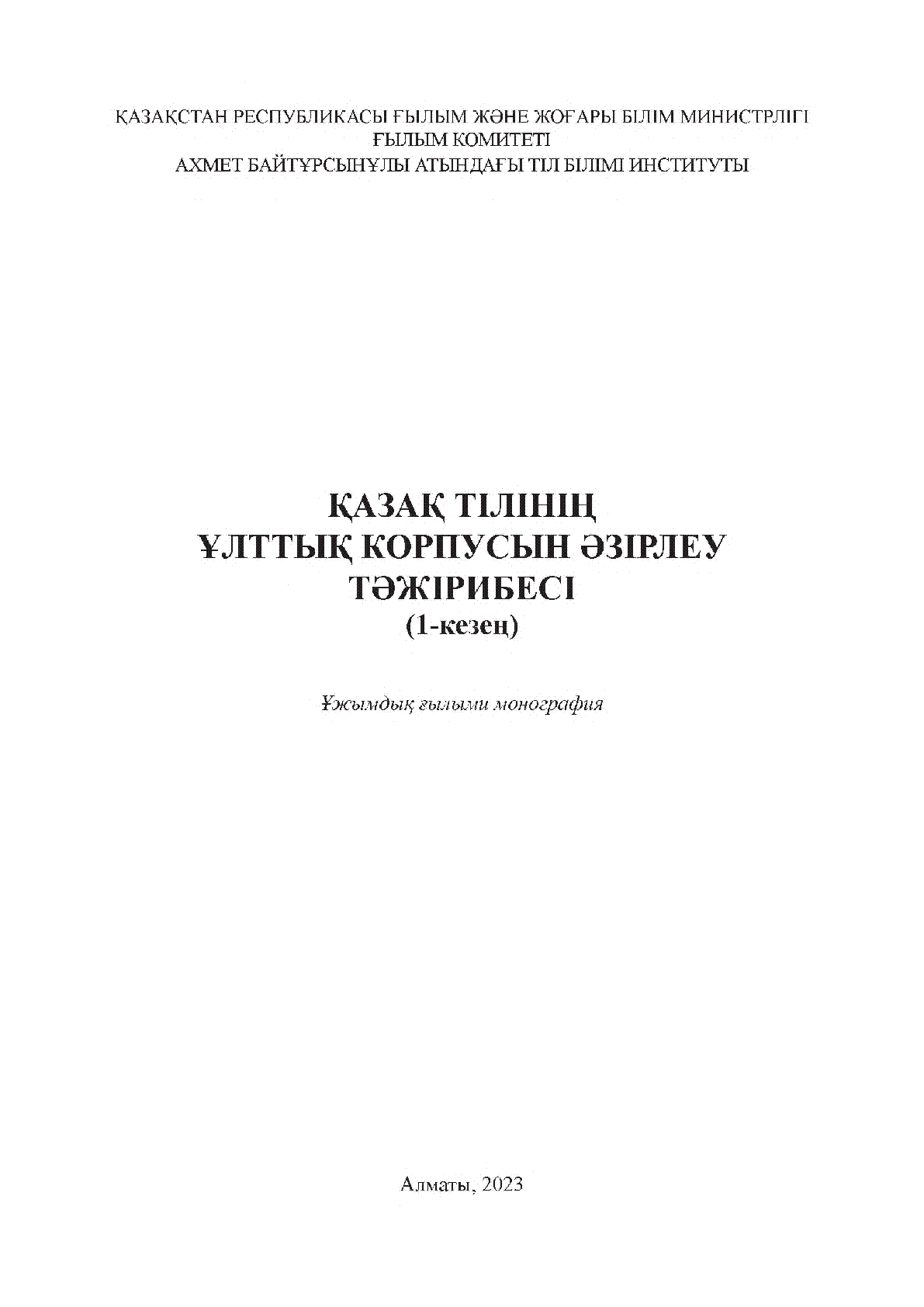 Қазақ тілінің ұлттық корпусын әзірлеу тәжірибесі (1-кезең) [Мәтін] : ұжымдық ғылыми монография / ; Қазақстан Республикасы Ғылым және жоғары білім министрлігі, Ғылым комитеті ; Ахмет Байтұрсынұлы атындағы Тіл білімі институты ; жоба жетекшісі және жалпы редакциясын басқарған: А. Фазылжан ; бас редактор: А. Жаңабекова... – Алматы : ЖК Асыл, 2023. - 445 б. . – Пайдаланған әдебиеттер: 383-396 б. . – 150 дана – ISBN 978-601-7928-24-7
