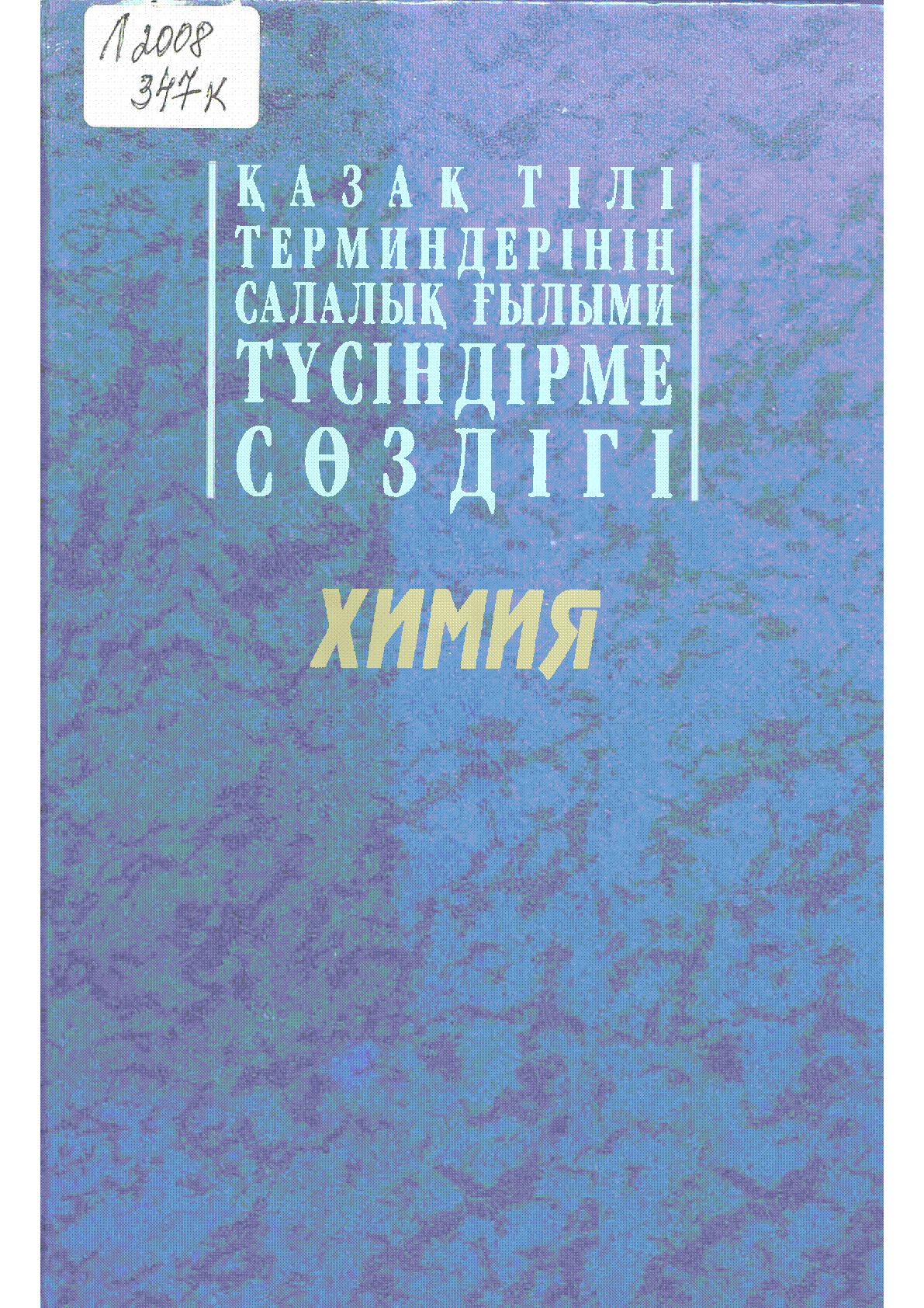 Қазақ тілі терминдерінің салалық ғылыми түсіндірме сөздігі. Химия [Мәтін] : 5500-ге жуық термин / А. Ниязбаева Р. Рысқалиева Н. Нұрахметов Н. Далабаева ; ҚР Мәдениет және ақпарат министрлігі... – Алматы : Мектеп, 2007. - 336 б.– (Қазақ тілі терминдерінің салалық ғылыми түсіндірме сөздіктері. - Қазақ тілі терминдерінің салалық ғылыми түсіндірме сөздіктерінің топтамасы Қазақстан Республикасының Президенті Н. Ә. Назарбаевтың Жарлығымен бекітілген «Тілдерді қолдану мен дамытудың 2001-2010 жылдарға арналған мемлекеттік бағдарламасына» сәйкес шығарылып отыр. - Қазақстан Республикасы Мәдениет және ақпарат министрлігі Ақпарат және мұрағат комитеті 017 "Әлеуметтік маңызды әдебиет түрлерін шығару" бағдарламасы . – Библиогр.: 332-333 б. . – 3000 дана – 9965-36-416-8 (мұқ.) : 70 тг.