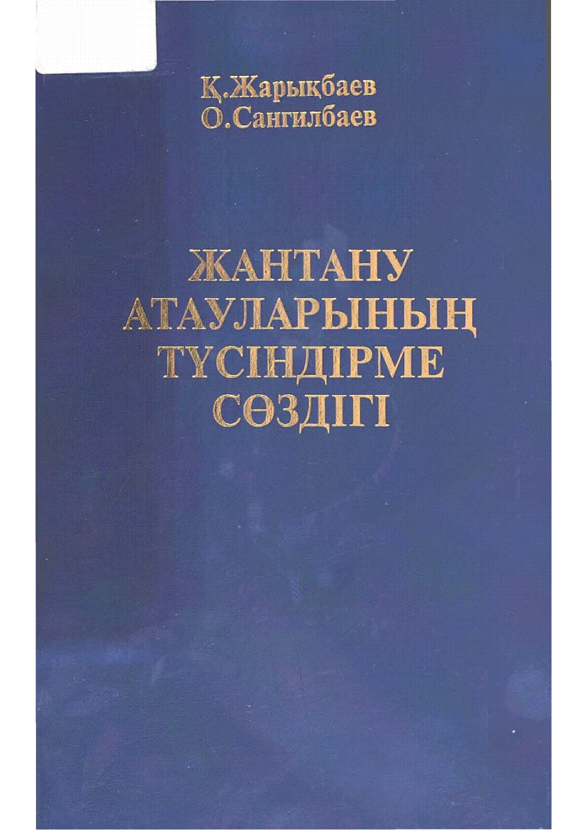 Жантану атауларының түсіндірме сөздігі [Мәтін] / Қ. Б. Жарықбаев О. С. Сангилбаев ... – Алматы : Сөздік-Словарь, 2006. - 382 б. - Мәдениет, ақпарат министрлігінің бағдарламасымен басылып шықты . . – 2000 дана – ISBN 9965-409-98-6 (мұқ.) : 693 тг.