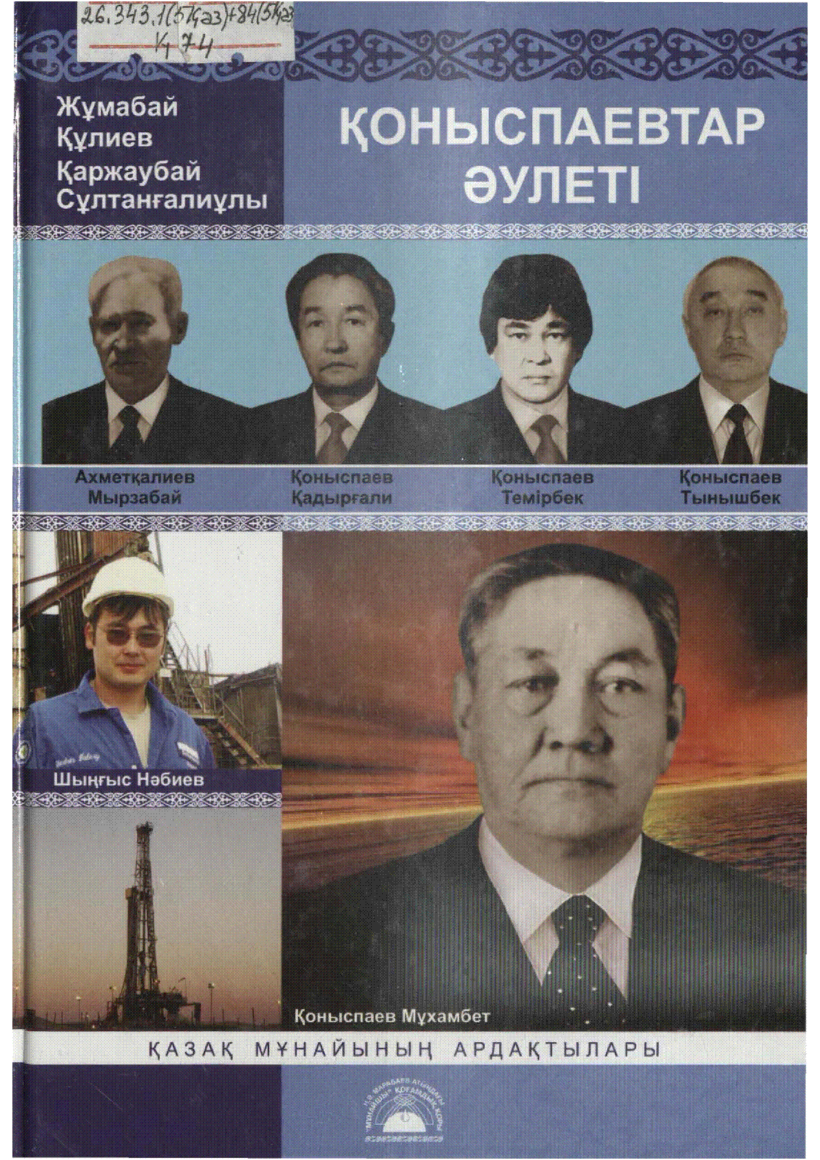 Қоныспаевтар әулеті [Мәтін] / Құлиев, Жұмабай Сұлтанғалиұлы, Қаржаубай ... – Алматы : "Мұнайшы" қоғамдық қоры, 2013. - 313, [1] б., [12] п. сурет– (Қазақ мұнайының ардақтылары. : Өмірбаян сериясы . . – 500 дана – 978-9965-816-53-6 (мұқ.) : 40 тг.