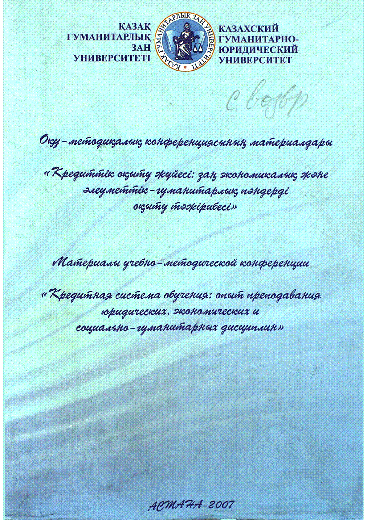 Кредитная сиcтема обучения: опыт преподавания юридических, экономических и социально-гуманитарных дисциплин : материалы учебно-методической конференции / ... – Астана : Изд-во КазГЮУ, 2007. - 75 с. - Текст на рус. и каз. языках . – Библиогр.: в конце ст. . – 9965-629-90-0