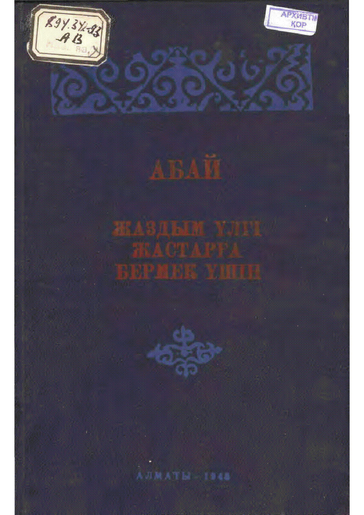 Жаздым үлгі жастарға бермек үшін [Мәтін] : мектеп оқушыларына арналған жийнақ / А. Құнанбаев ; [құраст. М. Балақаев]... – Алматы : Қазақтың біріккен мемлекет баспасы, 1945. - 85 б. - Мәтін қазақ тілінде латын қарпымен . . – 10000 дана (мұқ.) : 5 тг.