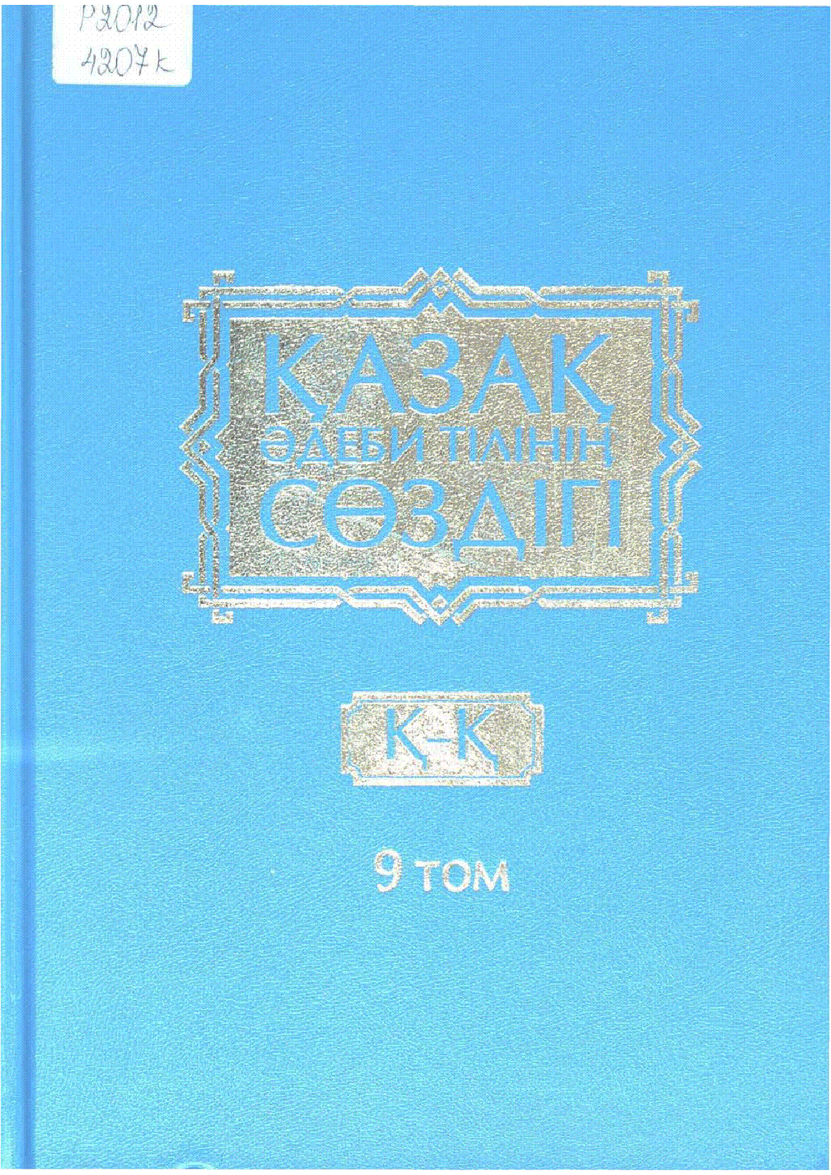 Қазақ әдеби тілінің сөздігі [Мәтін] : он бес томдық ; Қазақстан Республикасы Мәдениет министрлігі, Тіл комитеті ; Қазақстан Республикасы Білім және ғылым министрлігі, Ғылым комитеті ; А. Байтұрсынұлы атындағы Тіл білімі институты ; [жалпы редакциясын басқарған: А. Ысқақов, Н. Уәли ; құрастырғандар: Ә. Ыбырайым, А. Жаңабекова, Қ. Рысбергенова [ж. б.] ; томның редакторы А. Жаңабекова]] .- Алматы : [б. ж.] , 2011. – Тілтаным.– 10000 дана . – ISBN 978-601-7293-20-8 (9-т.), ISBN 978-601-7293-11-6 (мұқ.) - Қазақстан Республикасында тілдерді дамыту мен қолданудың 2011-2020 жылдарға арналған мемлекеттік бағдарламасы аясында шығарылды. - Қазақстан Республикасы Мәдениет министрлігінің Тіл комитеті "Мемлекеттік тілді және Қазақстан халқының басқа тілдерін дамыту" бағдарламасы бойынша шығарылды. - Марал Хасен қоры. - Тұрсынбек Кәкішұлы қоры. - Мырзатай Жолдасбеков қоры . 9-том . Қ-Қ– 742 б. (мұқ.) : 1500 тг.