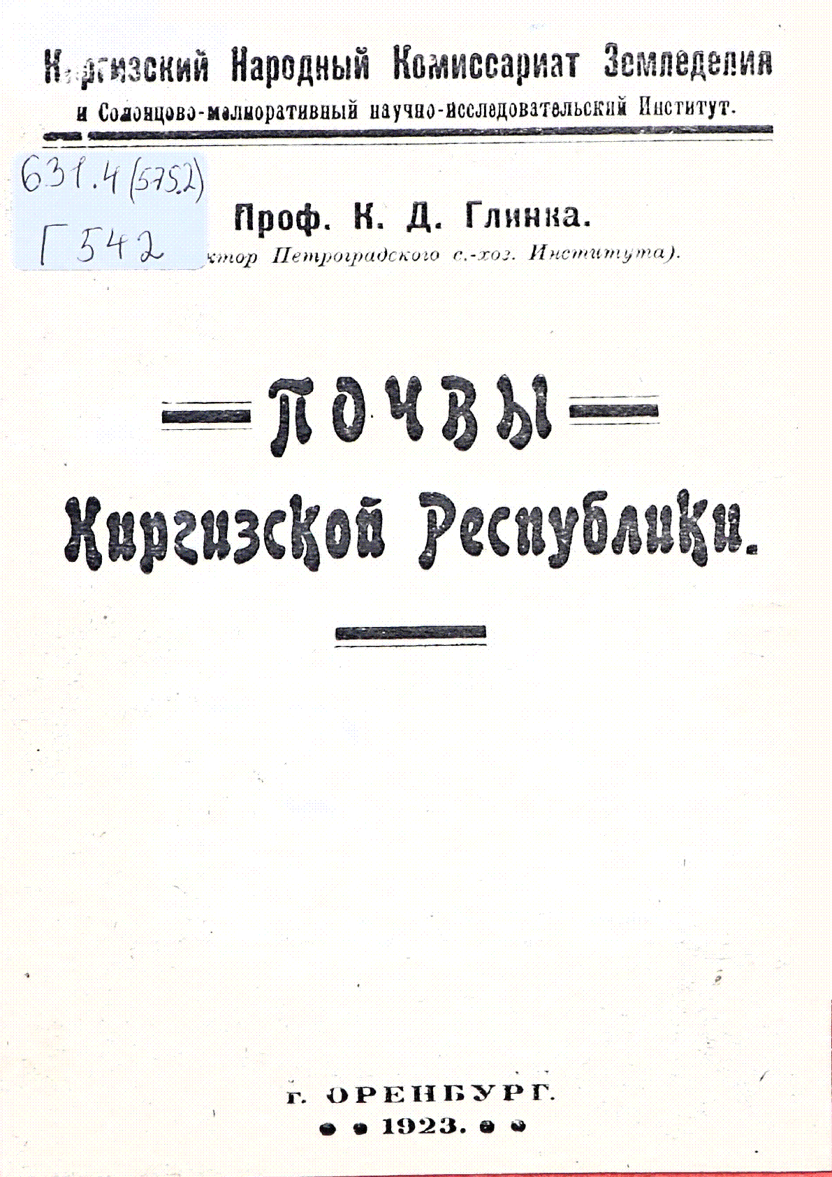 Почвы Киргизской Республики [Текст] / К. Д. Глинка ; Киргизский народный комиссариат земледелия, Солонцово-мелиоративный научно-исслед. ин-т... – Оренбург : Русско-Киргизская тип. Киргосиздата, 1923. - 84, [1] с. . – Библиогр.: в подстроч. примеч. . – 1250 экз. (в пер.) : 50 тг.