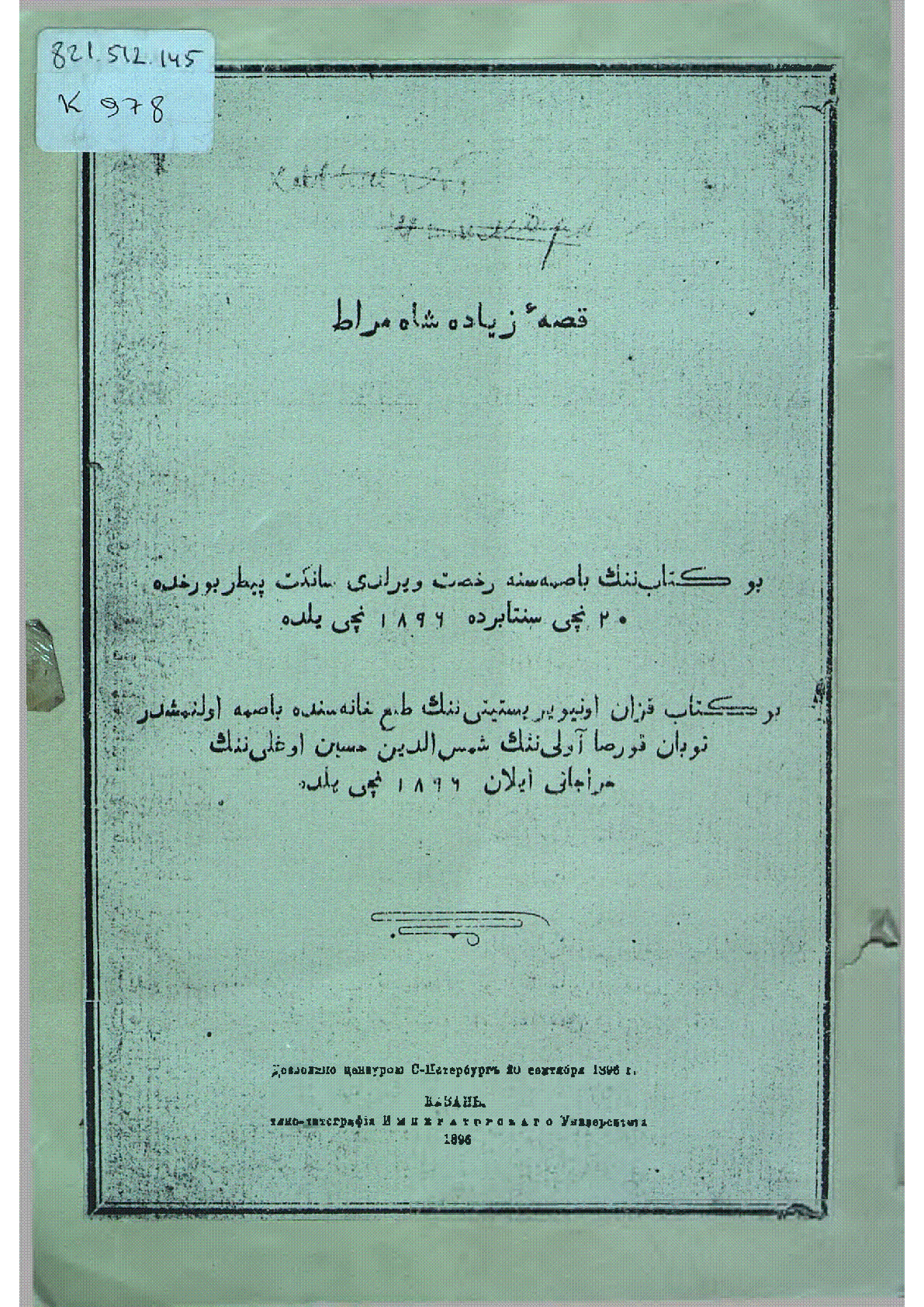 Кысса Зияда Шах-Мурат = قصهْ زياده شاه مراط [Text] / ; ред. Ш. Хусейнов... – Казань : Типо-литография Императорского Университета, 1896. - 48 с. - Текст на татарском яз. в арабской графике . . – [б. т.] : 20 тг.