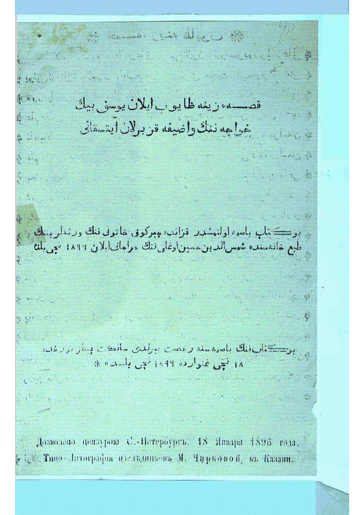 Кысса Зина Зайуб илян Юсуф бек хожаның уазифа кыз бирлен айтысканы = قصهء زينه ظايوب ايلان يوسف بيك خواجه ننك واضيفه قز براتن آيتسقانى [Text] / ... – Казань : Тип. наследников М. Чирковой, 1896. - 27 с. - Текст на татарском языке в арабской графике . . – [б. т.] : 10 тг.