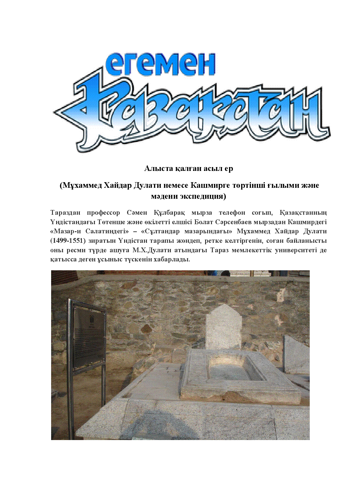 Дербісәлі, Ә. Алыста қалған асыл ер [Мәтін] : Мұхаммед Хайдар Дулати немесе Кашмирге төртінші ғылыми және мәдени экспедиция / Ә. Дербісәлі // Егемен Қазақстан. - 2018. - №206. - 29. - қазан. - 8 б. ISSN<br>