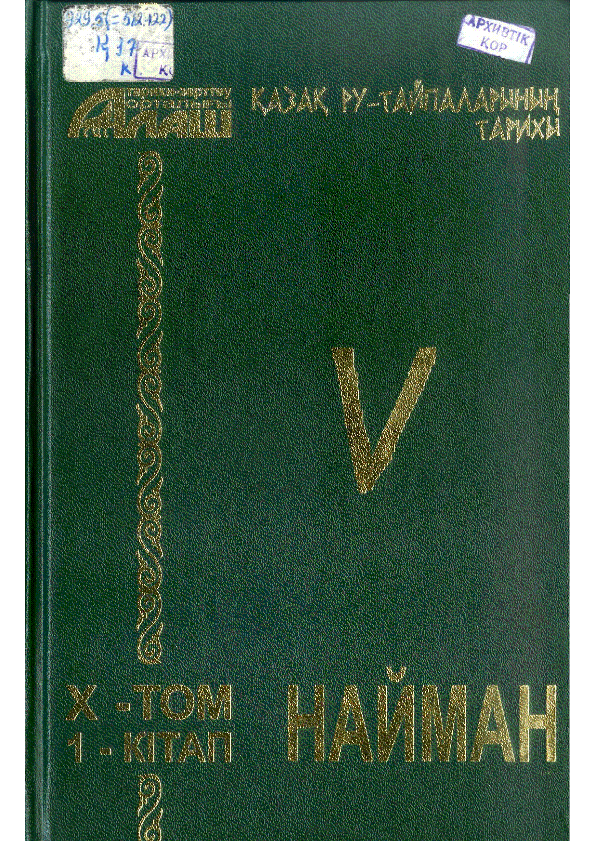 Қазақ ру-тайпаларының тарихы [Мәтін] ; "Алаш" тарихи-зерттеу орталығы ; Автор. : Ғабжалилов Х.М., Омарбеков Т., Кәрібаев Б.Б. ж.б.- Алматы : Алаш , 2008. X том, 1 - ші кітап : Найман) .– 1000 дана . – 9965-765-19-7(10т.1к.) – 457 б.