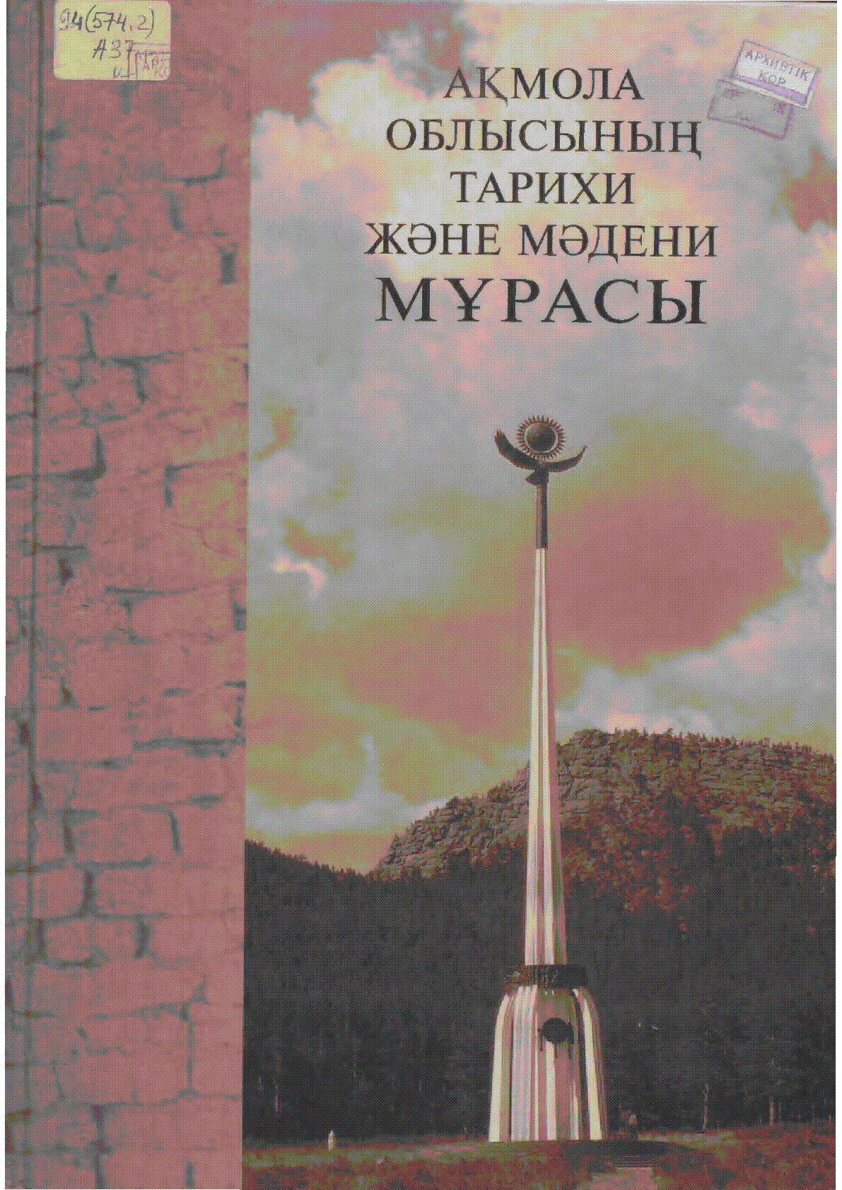 Ақмола облысының тарихи және мәдени мұрасы [Мәтін] : ескерткіштер жиынтығы / ; Ақмола облысы мәдениет басқармасының тарихи-мәдени мұраны қорғау және пайдалану бойынша орталығы ; [редакциялық алқа: В. Ф. Зайберт [ж. б.]]... – Астана : "Қазқалпына келтіру" РМК ҒЗЖФ, 2008. - 494, [1] б., суретті; - Мырзатай Жолдасбеков қоры . – Библиогр.: 465-471 б. - Көрсеткіштер: 475-496 б. . – 500 дана – ISBN 9965-23-183-4 (мұқ.) : 0 теңге