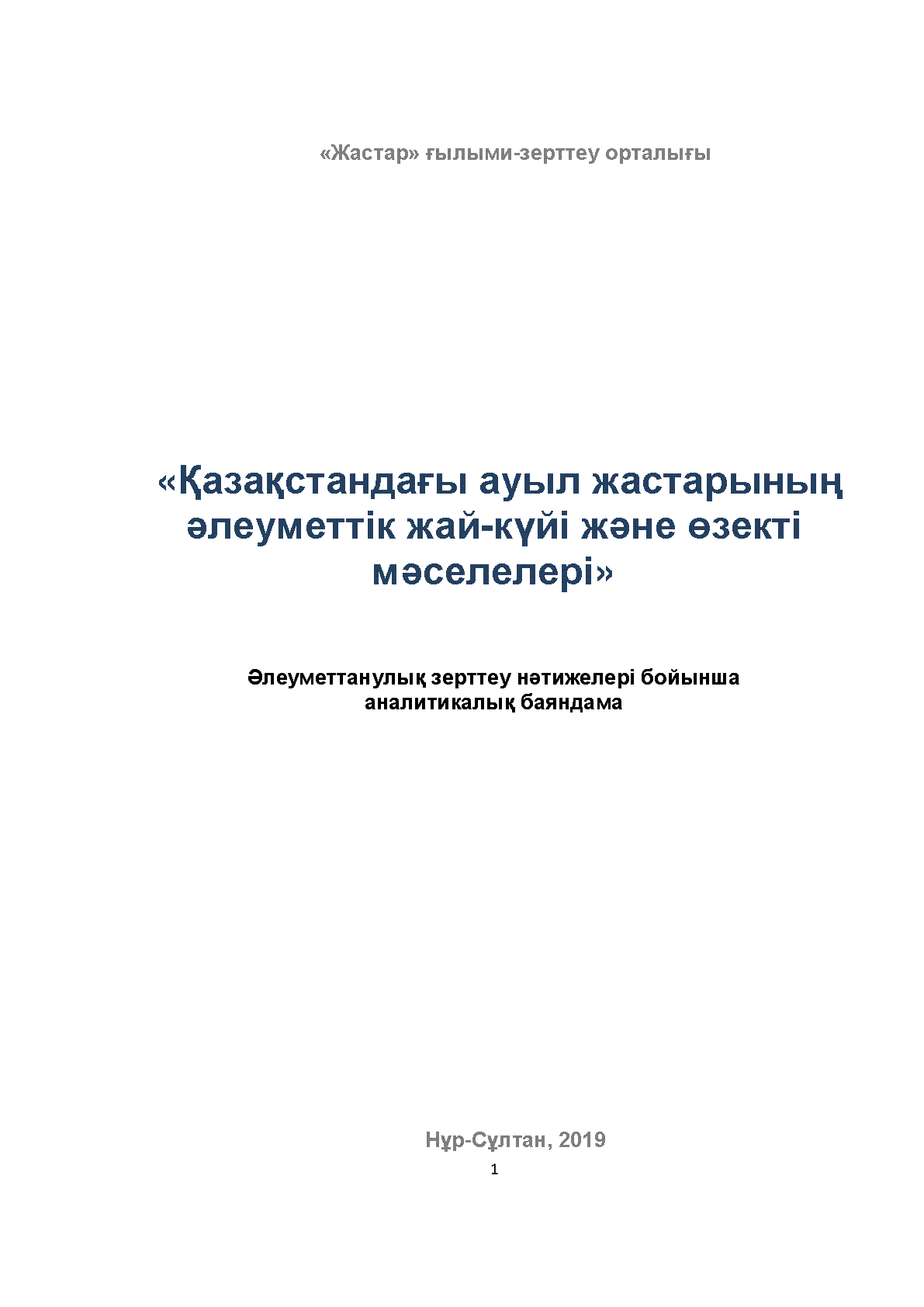 Қазақстандағы ауыл жастарының әлеуметтік жай-күйі және өзекті мәселелері [Мәтін] : әлеуметтанулық зерттеу нәтижелері бойынша аналитикалық баяндама / ; «Жастар» ғыл.-зерт. орталығы... – Нұр-Сұлтан : [б. ж.], 2019. - 178 б. : - Мәтін қаз., орыс тілд. . . – [т. ж.]