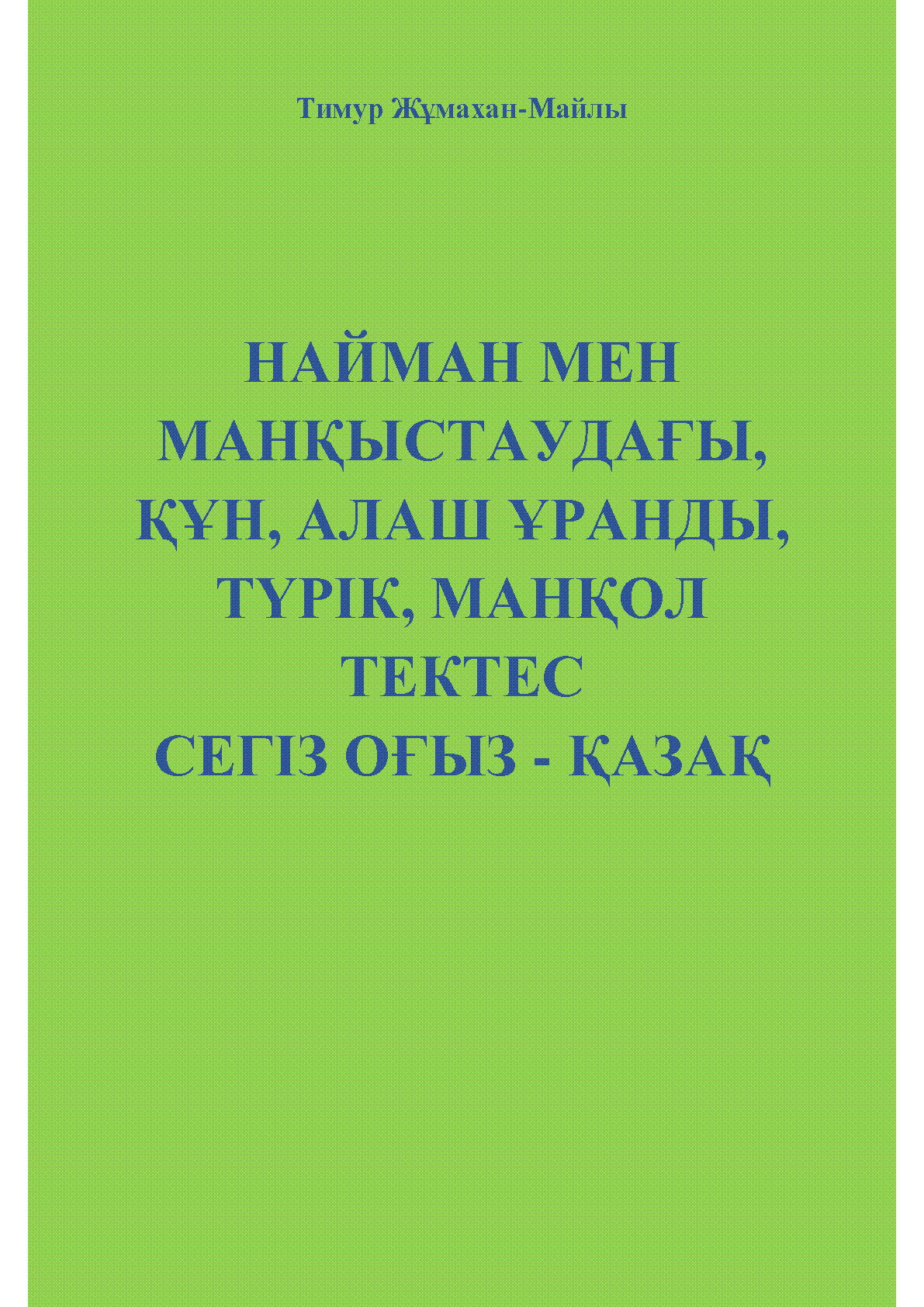 Найман мен Манқыстаудағы, Құн, Алаш ұранды, Түрік, Манқол тектес Сегіз Оғыз - Қазақ [Мәтін] / Т. Жұмахан-Майлы ... – Астана : [б. ж.], 2023. - 228 б. . – Библ.: 225-227 б. . – [т. ж.] – ISBN 978-601-06-9124-7