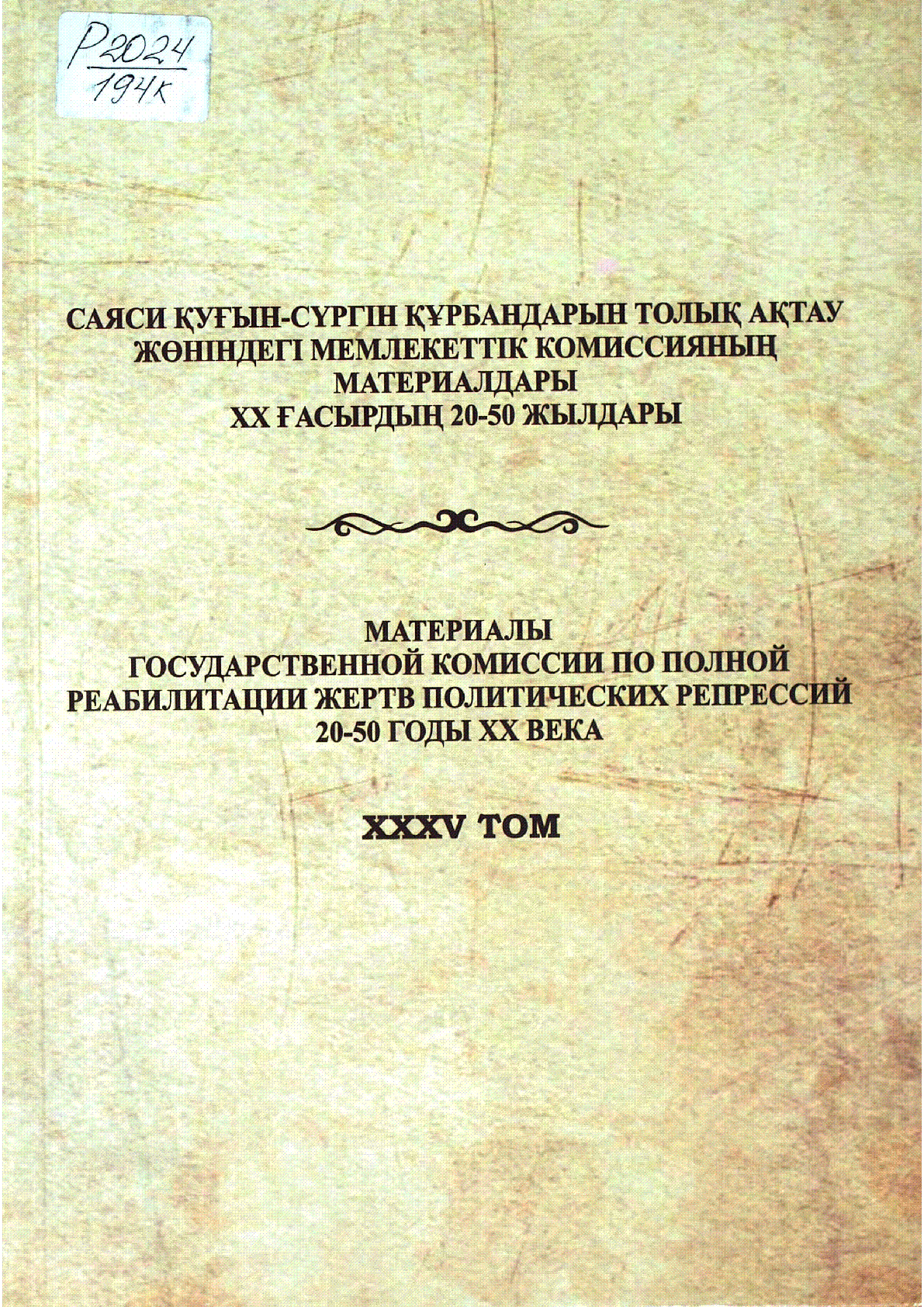 Саяси қуғын-сүргін құрбандарын толық ақтау жөніндегі Мемлекеттік комиссияның материалдары: ХХ ғасырдың 20-50 жылдары [Текст] : Материалы Государственной комиссии по полной реабилитации жертв политических репрессий: 20-50 годы ХХ века ; [составители: Г. К. Кокебаева [и др.] ; под общей редакцией Е. Т. Карина ; редакционная коллегия: С. Нұрбек [и др.] ; алғысөзі Т. Б. Дәулетұлы, С. А. Құранбек] ; Институт истории и этнологии имени Ч. Ч. Валиханова ; Проектный офис Государственной комиссии по полной реабилитации жертв политических репрессий .- Астана : Литера-М , 2023.– 1000 экз. . – ISBN 978-601-08-3013-4 (в пер.) - Заглавие с обложки. - Выпущено по программе "Повышение конкурентоспособности сферы культуры и искусства, сохранение, изучение и популяризация казахстанского культурного наследия и повышение эффективности реализации архивного дела", по подпрограмме "Приобретение, издание и рапространение социально важных видов литературы" Министерства культуры и информации Республики Казахстан . Т. 35 . Военнопленные и спецпереселенцы на юге Казахстана. Туркестанская область и г. Шымкент : сборник документов и материалов– 487 с., табл. . (в пер.) : 0 тг.