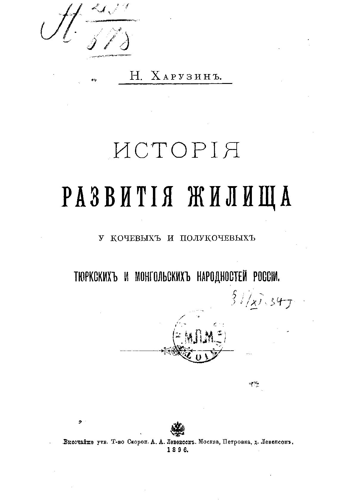 История развития жилища у кочевых и полукочевых тюркских и монгольских народностей России [Текст] / Н. Н. Харузин ... – Москва : Т-во скоропечатни А. А. Левенсон, 1896. - IV, 124, IV с., ил.; - Извлеч. из "Этногр. обозрения", 1896, № 1-2 . – Указ.: с. 125-128 . – [б. т.]