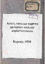 Ауыл, поселке партия ұяларын тазалау қорытындысы = اۋىل، پوسەلكە پارتىيا ۇيالارىن تازالاۋ قورتىندىسى [Мәтін] : Округтік партия комитеті бюросы мен Округтік бақылау комиссиясы президиумы бірлескен мәжілісінің қаулысы / ... – Кереку : Гос. тип., 1930. - 23 б.– (Кереку округтік партия комитеті. - Мәтін араб графикасымен жазылған. . . : 1000 дана