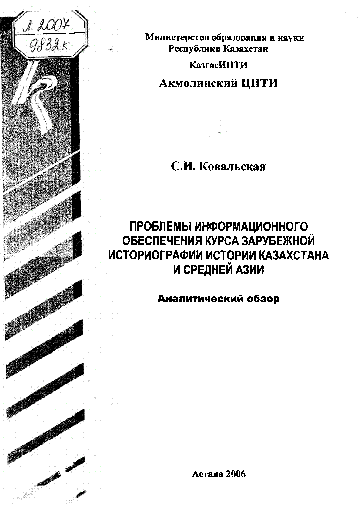 Проблемы информационного обеспечения курса зарубежной историографии истории Казахстана и Средней Азии [Текст] : аналитический обзор / С. И. Ковальская ; М-во образования и науки РК, КазгосИНТИ ; ДГП Акмолинский межотраслевой территориальный центр научно-технической информации... – Астана : ЦНТИ, 2006. - 62, [1] с. . – Библиогр.: с. 60-63 . – 500 экз. : 20 тг.
