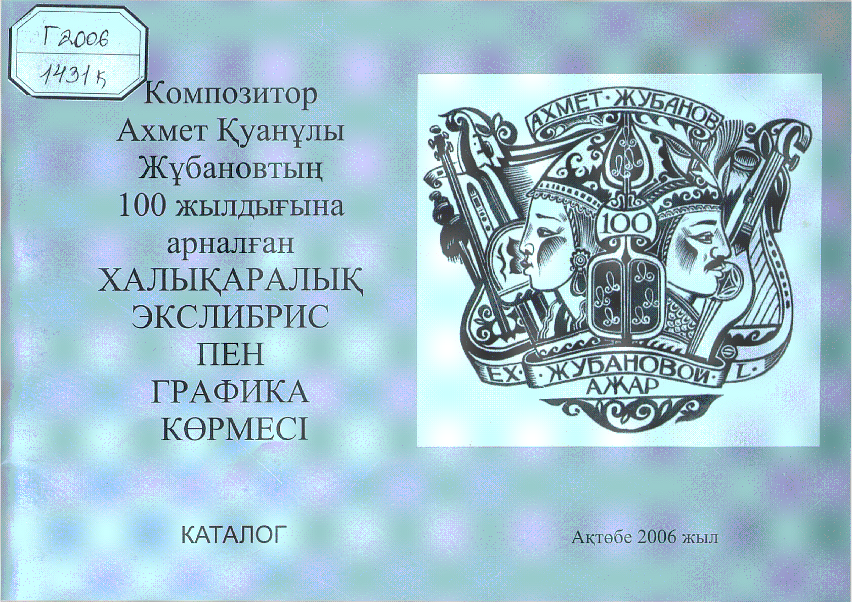Композитор Ахмет Қуанұлы Жұбановтың 100 жылдығына арналған Халықаралық экслибрис және графика көрмесі [Бейне материал] = Международная выставка экслибриса и графики, посвященная 100-летию композитора, академика Ахмета Куановича Жубанова = International exlibris and graphic exhibition dedicated to 100 anniversary of the Composed Akhmet Ckuanuli Zhubanov [Мультимедиа] / ; көрме кураторы: Ә. Өтеген-Тана ; ред. алқасы: С. Нұрқатова, М. Жақсығарина, А. Жұбанов [ж. б.] ; Ақтөбе облыстық мәдениет басқармасы... – Ақтөбе : NOBEL, 2006. - 54, [2] б., суретті; - Мәтін қазақ, орыс және ағыл. тілдерінде қатар . . – 1000 дана – ISBN 9965-437-75-0