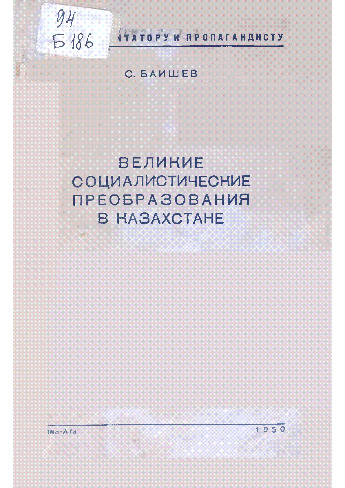 Великие социалистические преобразования в Казахстане [Текст] / C. Б. Баишев ... – Алма-Ата : Казгосиздат, 1950. - 47, [1] с.– (В помощь агитатору и пропагандисту. . . – 25000 экз. : 50 тг.