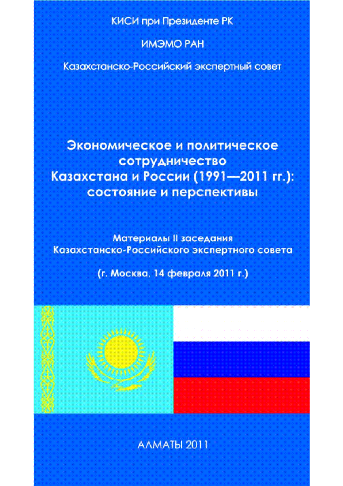 Экономическое и политическое сотрудничество Казахстана и России (1991-2011 гг.): состояние и перспективы [Текст] : Материалы II заседания Казахстанско-Российского экспертного совета (г. Москва, 14 февр. 2011 г.) / ... – Алматы : КИСИ при Президенте РК, 2011. - 153, [1] c. . . – 500 экз. – 978-601-7242-43-5 : 400 тг.