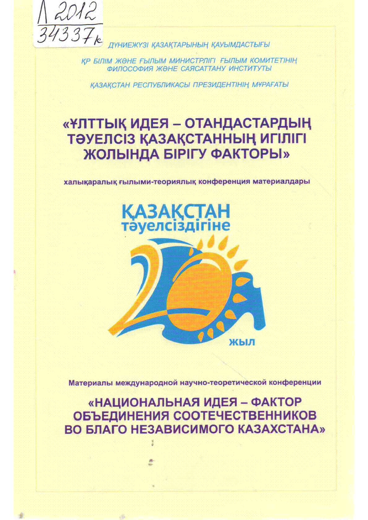 Ұлттық идея - отандастардың тәуелсіз Қазақстанның игілігі жолында бірігу факторы = Национальная идея - фактор объединения соотечественников во благо независимости Кахахстана [Мәтін] : халықаралық ғылыми-теориялық конференция материалдары 14 қыркүйек 2011 ж. / ; [ред. алқа: Т. А. Мамашев [ж. б.] ; құраст.: Қ. Н. Балтабаева [ж. б.]] ; Дүниежүзі қазақтарының қауымдастығы ; ҚР Білім және ғылым министрлігі ғылым комитетінің философия және саясаттану ин-ты ; ҚР Президентінің мұрағаты... – Алматы : Атажұрт, 2011. - 270, [1] б. - Қазақстан Тәуелсіздігіне 20 жыл. - Мәтіні қаз., орыс тілд. . . – 500 дана – 978-601-7023-41-6 : 250 тг.