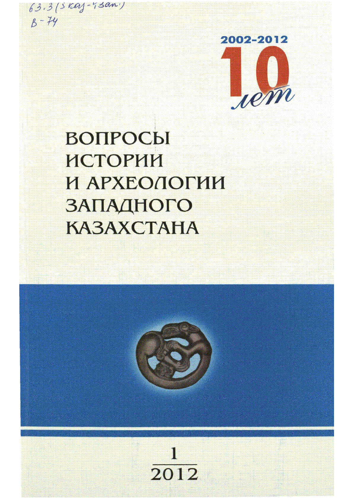 Вопросы истории и археологии Западного Казахстана [Text] : научный журнал : изд. с 2002 г. ; [гл. ред. М. Н. Сдыков] ; Западно-Казахстанский областной центр истории и археологии- Уральск : Полиграфсервис , 2012.– 500 экз. . – 9965-27-373-1 Библиогр. в конце ст. Вып. 16 . № 1, 2012– 157 с., ил. . : [б. ц.]
