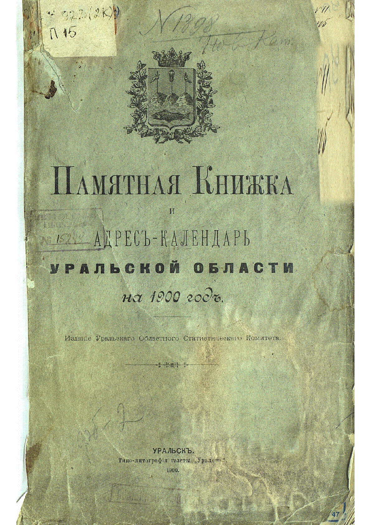 Памятная книжка и адрес-календарь Уральской области на 1900 год [Текст] / ... – Уральск : Типо-литография газ. "Уралец", 1900. - VI, 360 с., [3] табл., табл.; . .