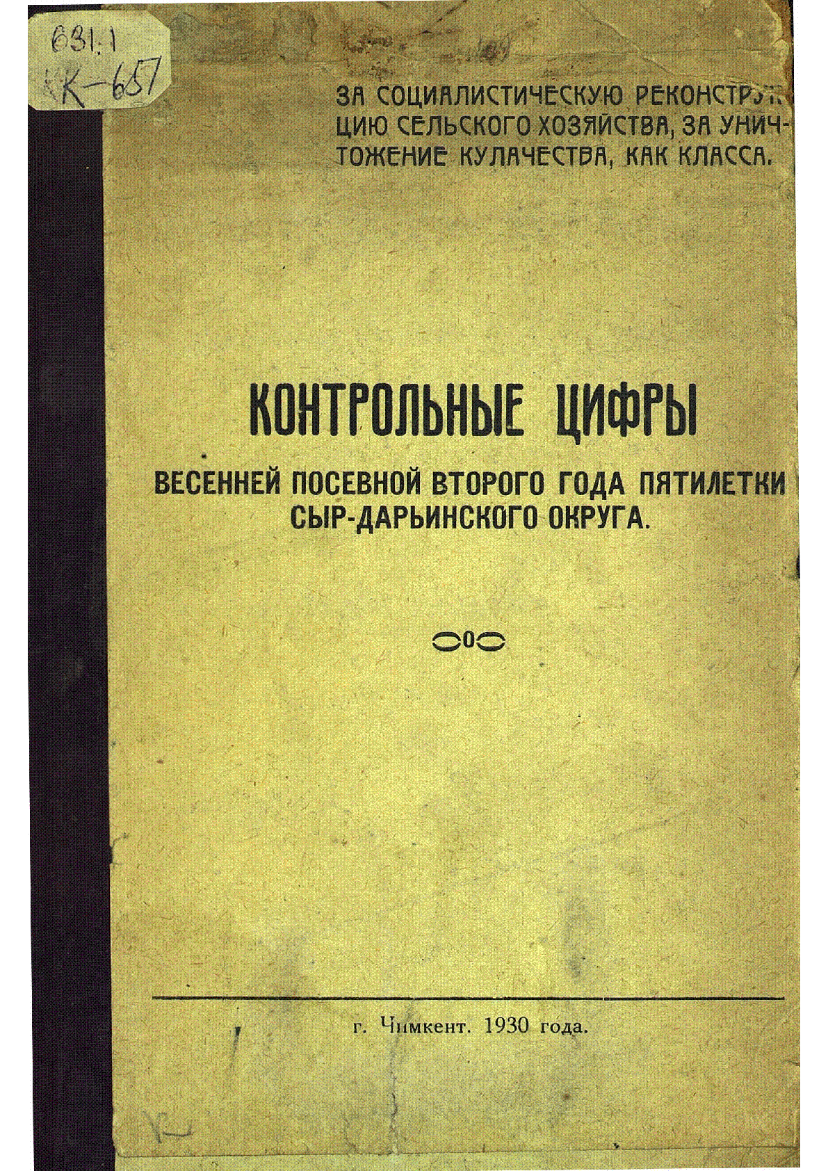 Контрольные цифры весенней посевной второго года пятилетки Сыр-Дарьинского округа [Текст] / ... – Чимкент : Типолитография ГОМХа, 1930. - 81 с., табл.; . . – [б. т.]