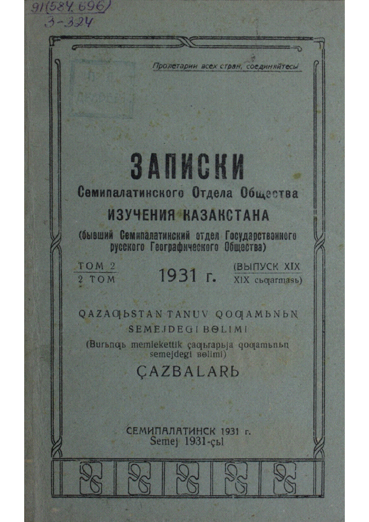 Записки Семипалатинского Отдела Общества изучения Казакстана (бывший Семипалатинский отдел Государственного русского Географического Общества) [Текст] ; [ред. комиссия С. М. Бабинцев, И. В. Власов, И. М. Евсеенко]- Семипалатинск : [б. и.] , 1931.– 650 экз. . - Из фонда Президентской библиотеки имени Б. Н. Ельцина РФ, г. Санкт-Петербург . Т. 2, вып. 19 .– 141 с., табл. .