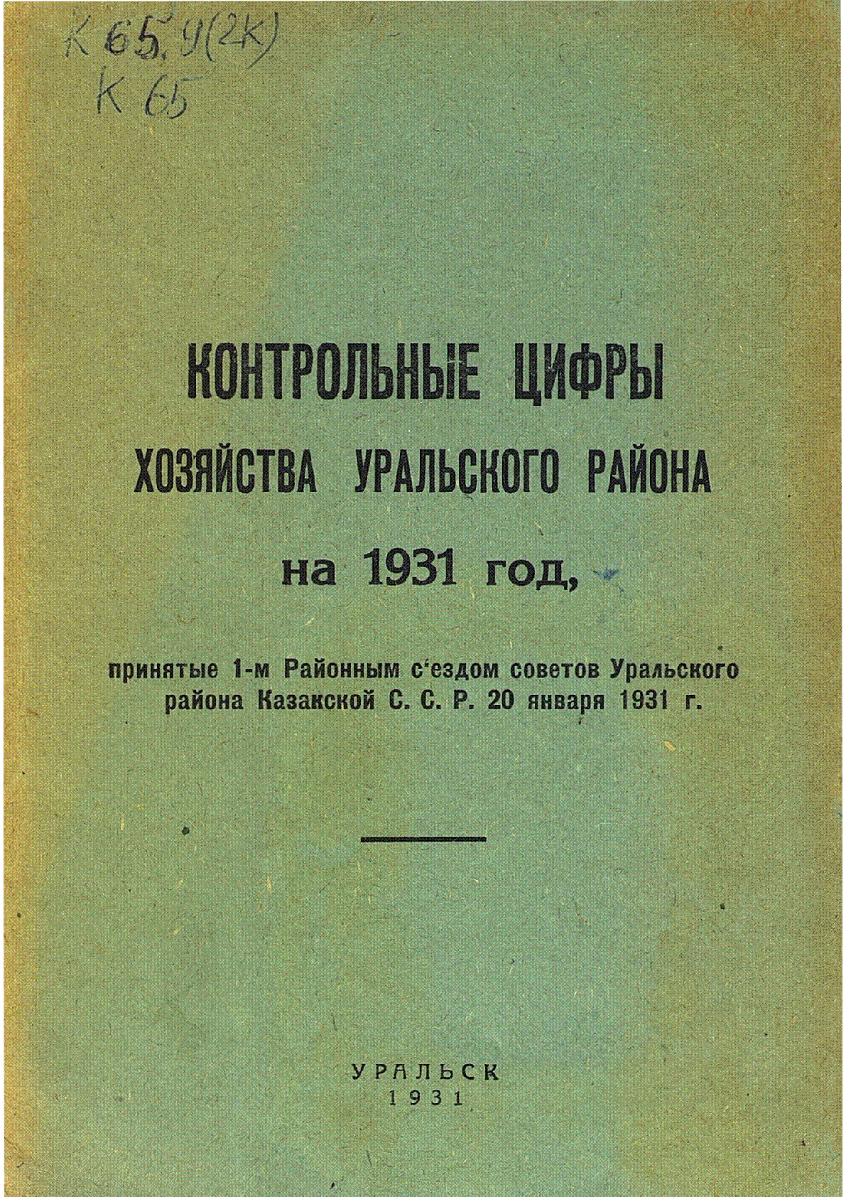 Контрольные цифры хозяйства Уральского района на 1931 год, принятые 1-м Районным съездом советов Уральского района Казахской С. С. Р. 20 января 1931 г. [Текст] / ... – Уральск : Гостипография им. Луначарского, 1931. - 18 с. . .