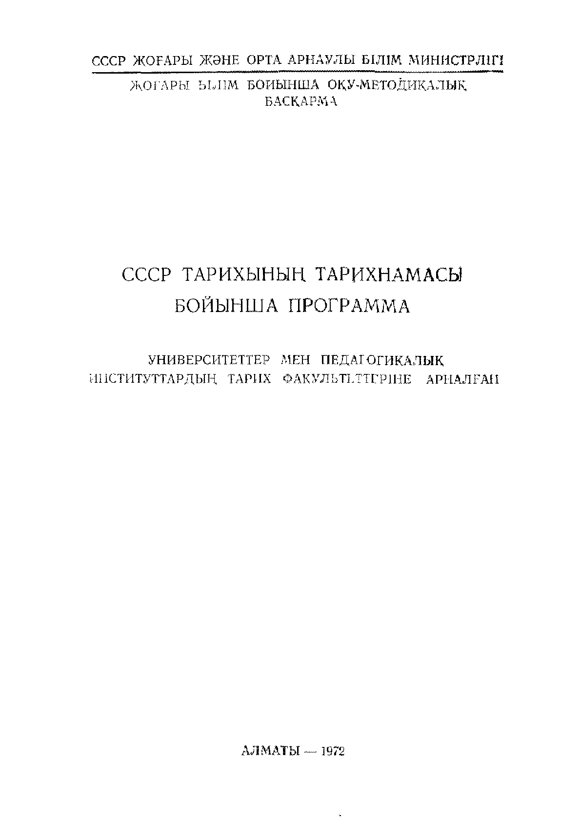 СССР тарихының тарихнамасы бойынша программа [Мәтін] : Университет пен педагогикалық институттардың тарих факультетіне арналған / ... – Алматы, 1972. - 34бет . .