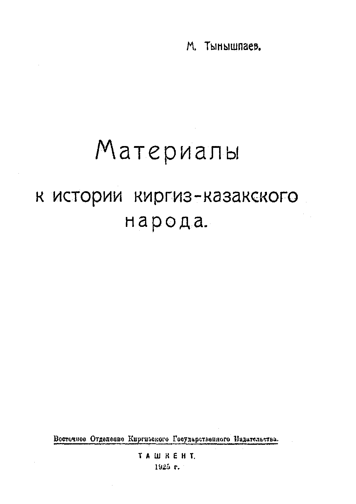 Материалы к истории киргиз-казакского народа [Текст] : (Читаны в Туркестанском Отделе Русского Географического Общества в 1924 и 1925 гг.). 1. Генеалогия киргиз-казакских родов.-2. Происхождение киргиз-казаков и история образования Казакского Ханства.-3. Родословные таблицы киргизских родов.-4. Общая численность киргиз-казакского народа (в 1917 г.) / М. Тынышпаев ... – Ташкент : Восточное Отделение Киргизского Государственного Издательства, 1925. - 62 с.+ табл. (8 л.) . . – Библиогр. в подстроч. примеч. . – [б. т.] : 20 тг.