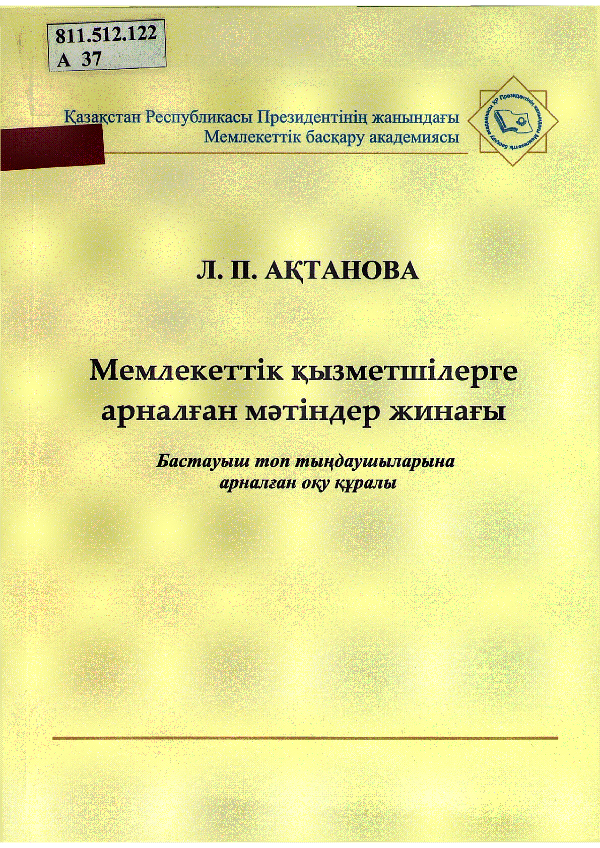 Мемлекеттік қызметшілерге арналған мәтіндер жинағы : Бастауыш топ тыңдаушыларына арналған оқу құралы / Ақтанова, Л. П. ... – Астана : [Б. ж.], 2009. - 134 б. . – Библиогр.: 131-132 б. . – 9965-797-69-2