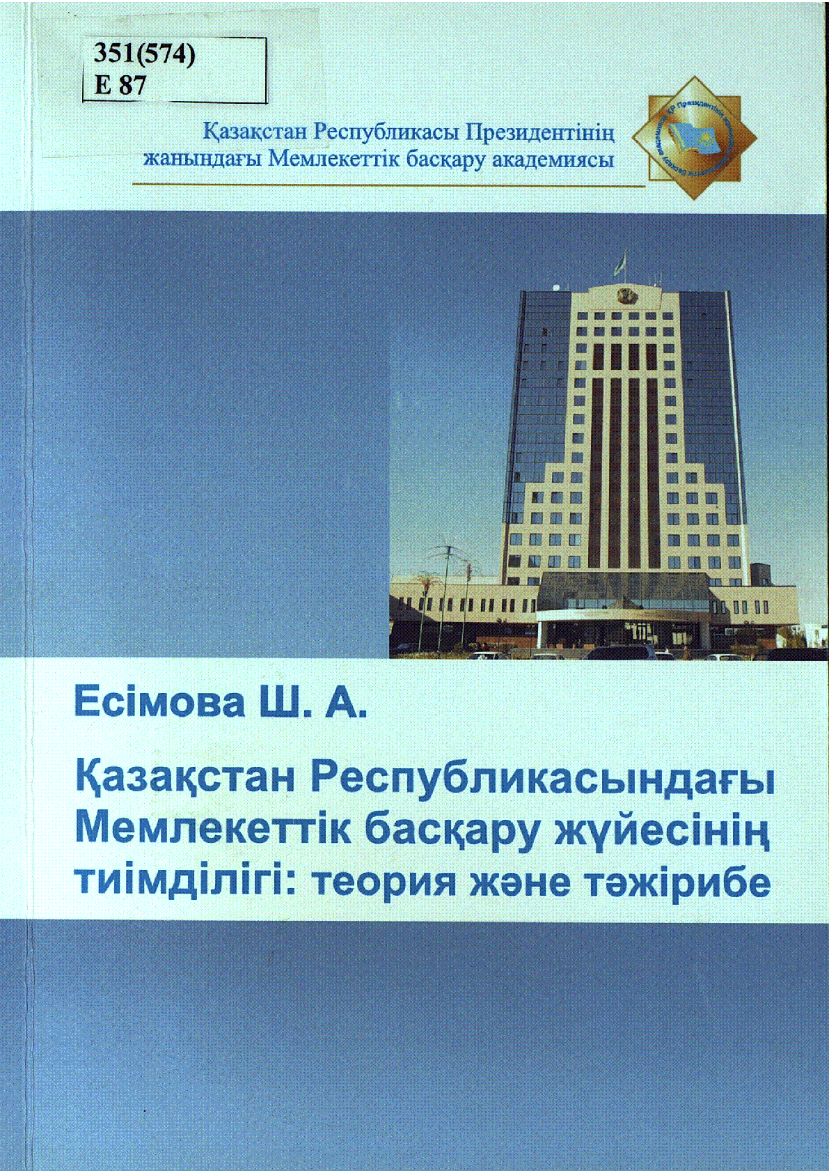 Қазақстан Республикасындағы мемлекеттік басқару жүйесінің тиімділігі: теория және тәжірибе / Есімова, Ш. А. ... – Астана : [Б. ж.], 2010. - 425 б. . – Библиогр.: 373-384 б. . – көрсетілмеген