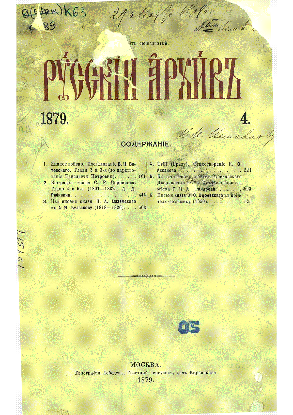Русский архив [Текст] ; сост. П. Бартенев- М. : Типография Лебедева , 1879. ٠4.1879 .– 550 с.