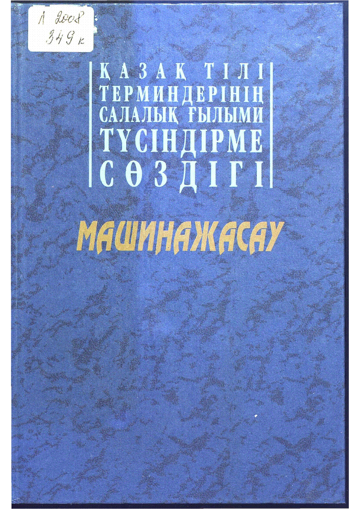 Қазақ тілі терминдерінің салалық ғылыми түсіндірме сөздігі. Машинажасау [Мәтін] : 3000-нан астам термин / Қ. Алипов Ж. Байбосынов А. Ибраев Ж. Есмуханов Д. Беков ; ҚР Мәдениет және ақпарат мин-гі... – Алматы : Мектеп, 2007. - 291 [2] б., суретті;– (Қазақ тілі терминдерінің салалық ғылыми түсіндірме сөздіктері. - Қазақстан Республикасы Мәдениет және ақпарат министрлігі Ақпарат және мұрағат комитеті 017 "Әлеуметтік маңызды әдебиет түрлерін шығару" бағдарламасы . – Библиогр.: 289-291 б. . – 3000 дана – ISBN 9965-36-417-6 (мұқ.) : 762 тг.