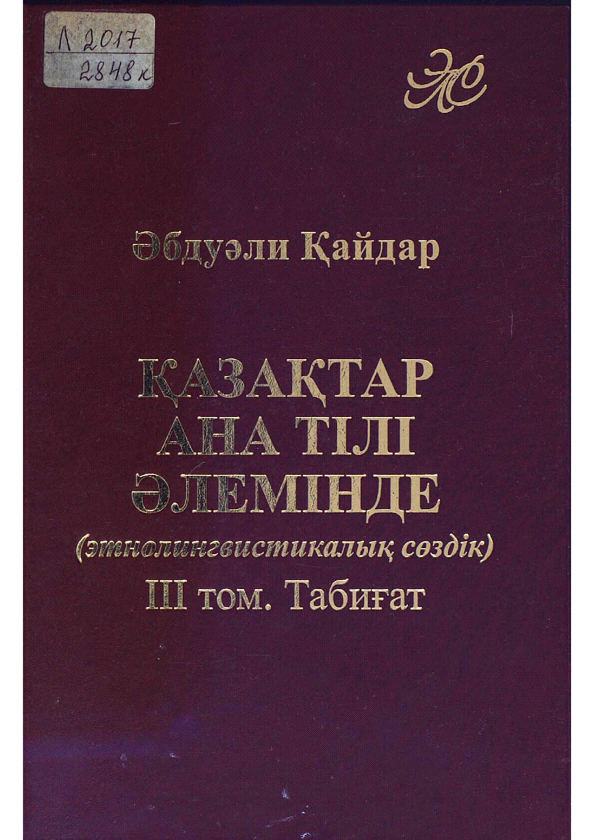 Қазақтар ана тілі әлемінде [Мәтін] : (этнолингвистикалық сөздік) / Ә. Қайдар ; [ред. Б. Қалиев] .- Алматы : Сардар , 2013.– 4000 дана . – ISBN 978-601-7174-35-4 (3-т.) (мұқ.), – ISBN 978-601-7174-33-0 - ҚР Мәдениет және ақпарат министрлігі Тіл комитетінің тапсырысы бойынша "Қазақстан Республикасында тілдерді дамыту мен қолданудың 2011-2020 жылдарға арналған мемлекеттік бағдарламасы" аясында шығарылды. - Марал Хасен қоры . Библиогр.: 603-605 б. 3-том . Табиғат– 607 б. (мұқ.) : 2664 тг.,