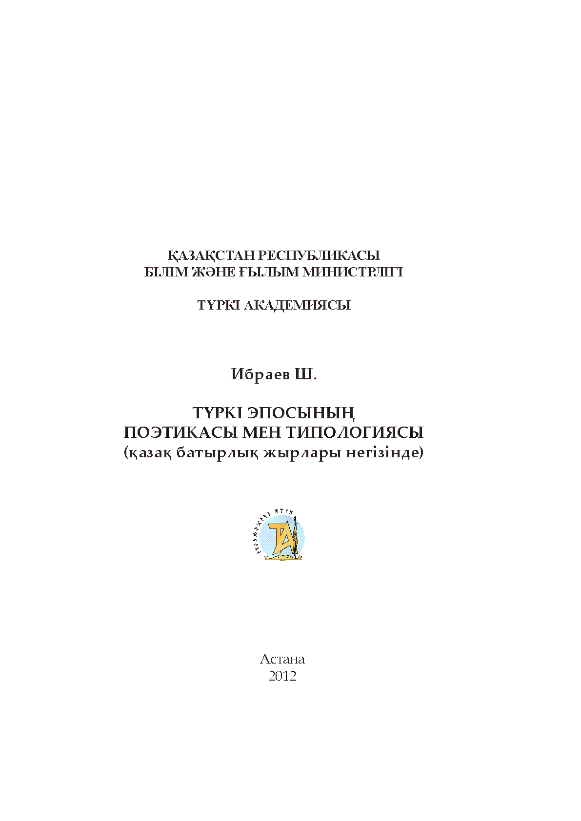 Түркі эпосының поэтикасы мен типологиясы (қазақ батырлық жырлары негізінде) [Text] / Ш. Ибраев ... – Астана : Сарыарқа, 2012. - 333 б.– (Қазіргі түркология. . . – 500 дана – 978-601-7340-27-8 (мұқ.) : 1 306 тг.