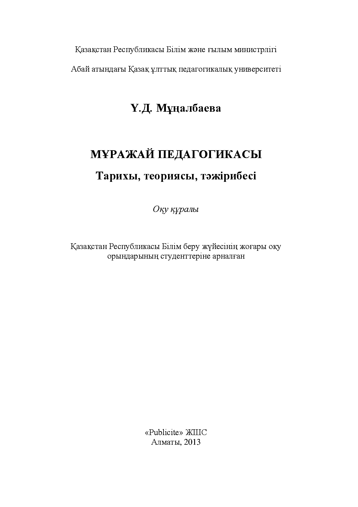 Мұражай педагогикасы [Text] : Тарихы, теориясы, тәжірибесі : оқу құралы / Мұңалбаева, Үмітхан Дәуренбекқызы ... – Алматы : Publicite, 2013. - 399 б., сурет.; . . – 500 дана – 978-601-80233-0 : [б. ж.]