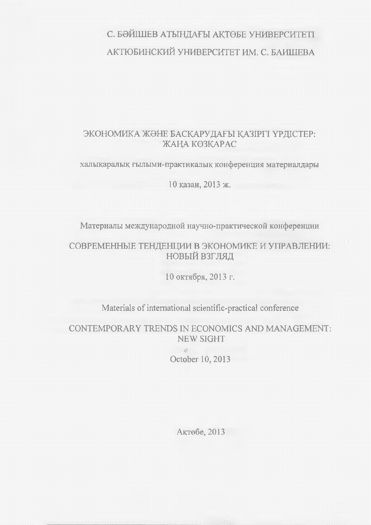 Современные тенденции в экономике и управлении : новый взгляд = Экономика және басқарудағы қазіргі үрдістер : жаңа көзқарас = Contemporary trends in economics and management : new sight [Text] : материалы международной научно-практической конференции : 10 октября 2013 г. / ; [редкол.: О. И. Лыгина [и др.]]... – Ақтөбе : Изд-во Актюбинского университета им. С. Баишева, 2013. - 279 с., ил.; . – Библиогр. в конце ст. . – 100 экз. – 978-9965-19-866-3 : [б. ц.]