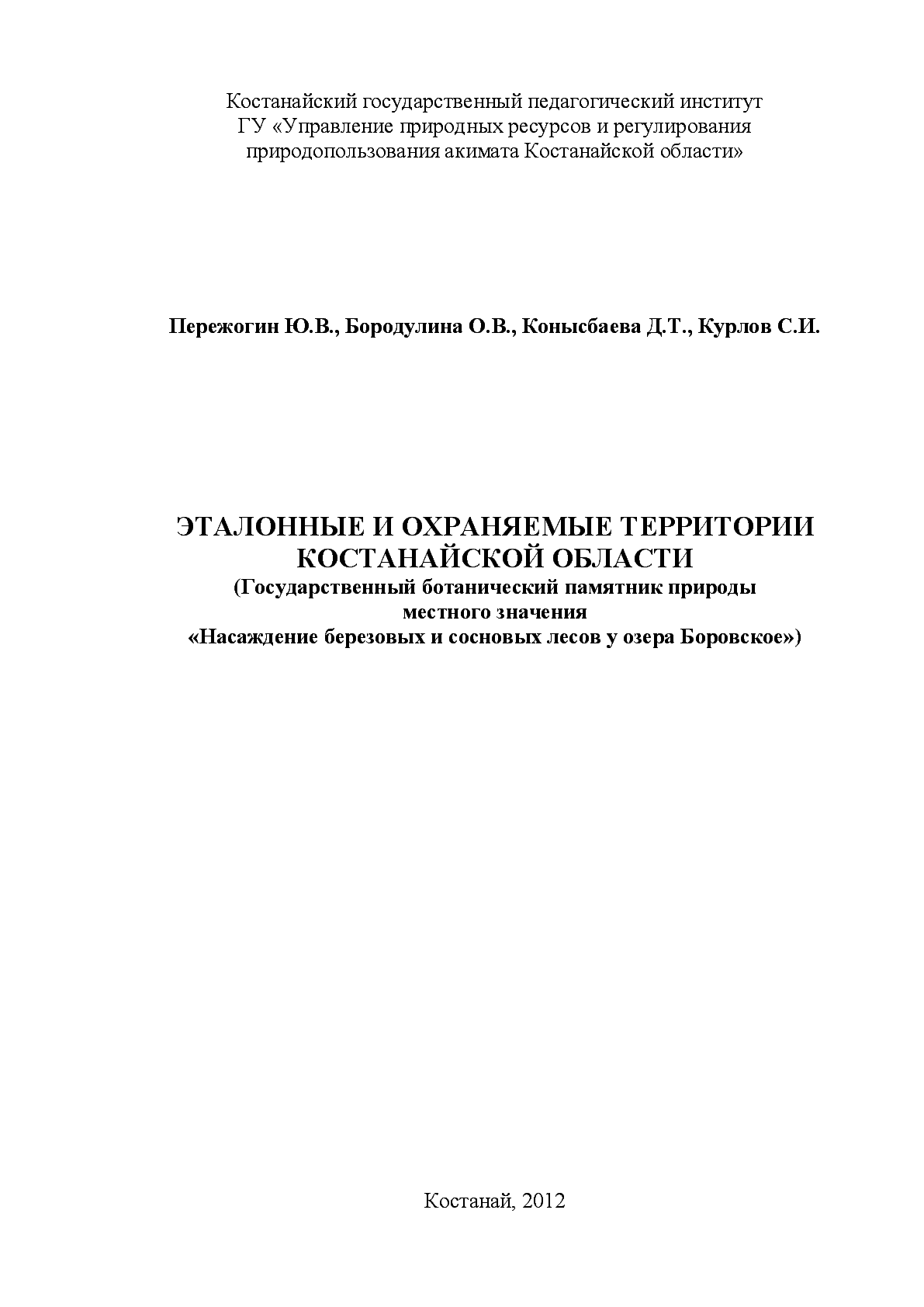 Эталонные и охраняемые территории Костанайской области (Государственный ботанический памятник природы местного значения "Насаждение березовых и сосновых лесов у озера Боровское") [Text] : (Государственный ботанический памятник природы местного значения "Насаждение березовых и сосновых лесов у озера Боровское") / Пережогин Ю. В., Бородулина О. В., Конысбаева Д. Т., Курлов С. И. ; [отв. ред. М. М. Сёмышев]... – Костанай : [б. и.], 2012. - 210 с., ил.; . – Библиогр.: с. 199-203 . – 100 экз. – 978-601-7109-66-0 : [б. ц.]