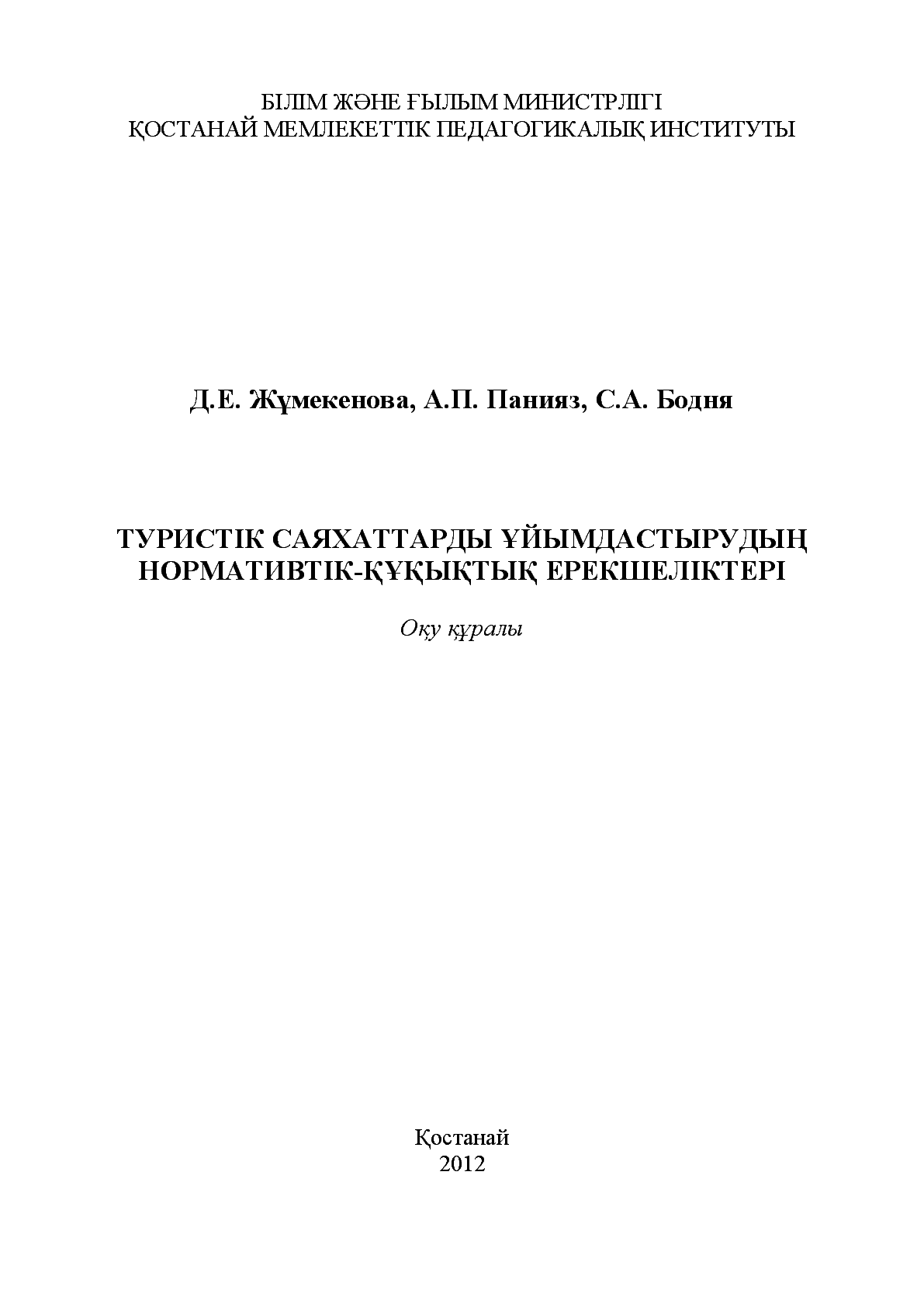 Туристік саяхаттарды ұйымдастырудың нормативтік-құқықтық ерекшеліктері [Text] : оқу құралы / Д. Е. Жұмекенова Панияз А. П., Бодня С. А. ... – Қостанай : [б. ж.], 2012. - 80 б. . – Библиогр.: 56-57 б. . – [т. ж.] – 978-601-7371-25-8 : [б. ж.]