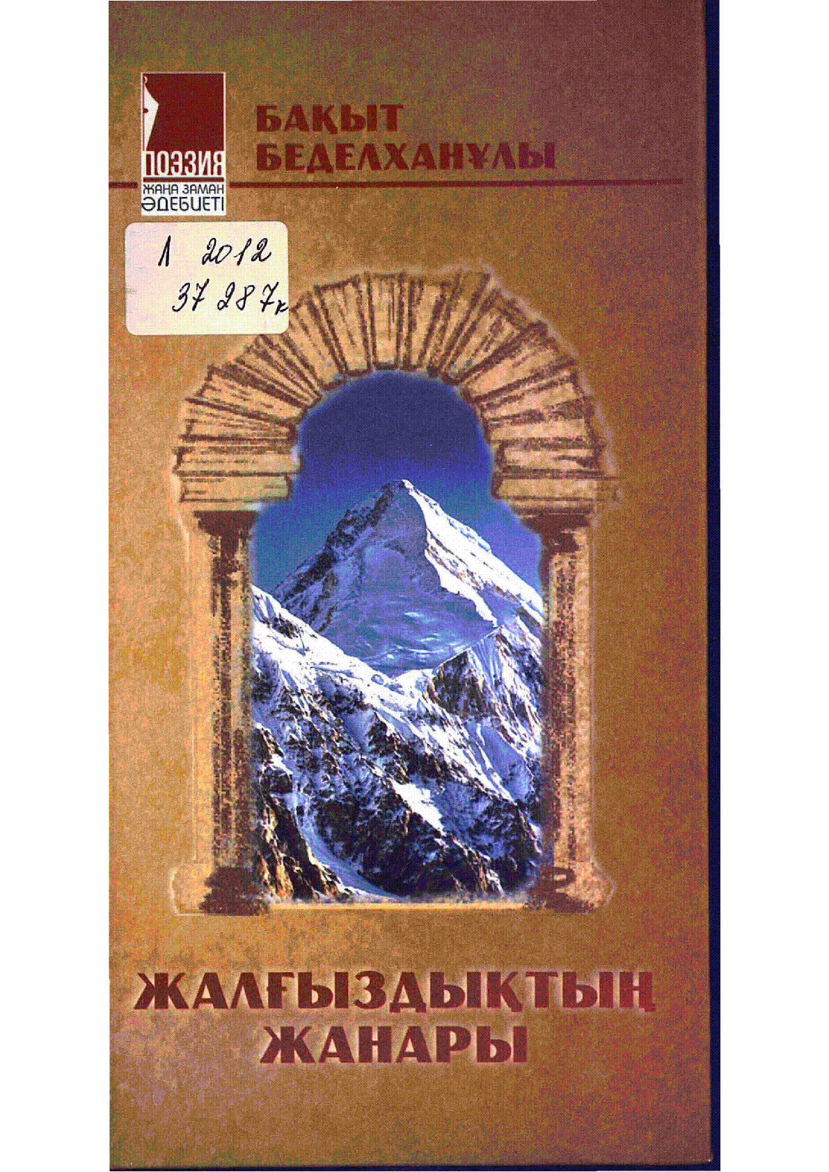 Жалғыздықтың жанары [Text] / Беделханұлы, Бақыт ... – Астана : Елорда, 2012. - 224 б.– (Жаңа заман әдебиеті: поэзия. - Қазақстан Республикасының Мәдениет және ақпарат министрлігі, Ақпарат және мұрағат комитетінің "Әдебиеттің әлеуметтік маңызды түрлерін басып шығару" бағдарламасы бойынша шығарылады . . – 9965-06-546-2 (мұқ.)