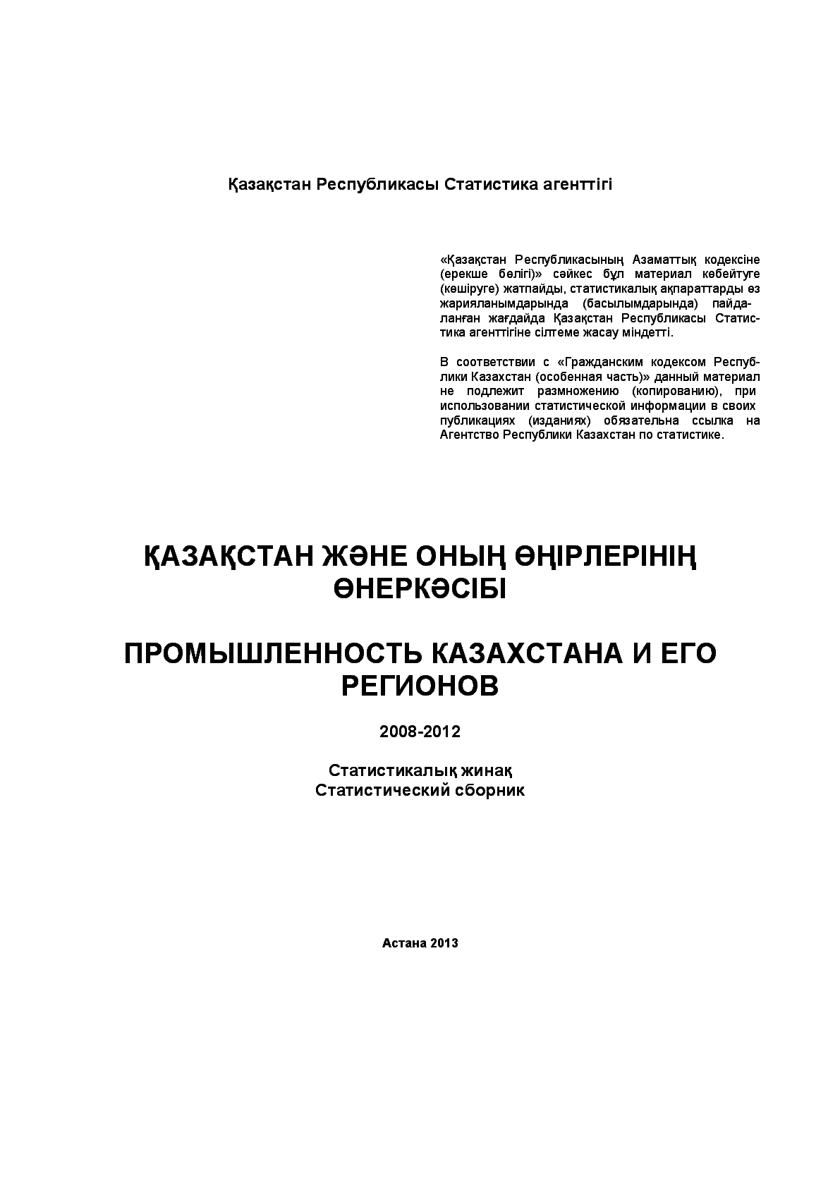 Қазақстан және оның өңірлерінің өнеркәсібі = Промышленность Казахстана и его регионов [Text] : 2008-2012 : статистикалық жинақ / ; [бас ред. Ә. А. Смайылов]... – Астана : [б. ж.], 2013. - 217 б., табл.; . . – 300 дана – көрсетілмеген : 30 тг.
