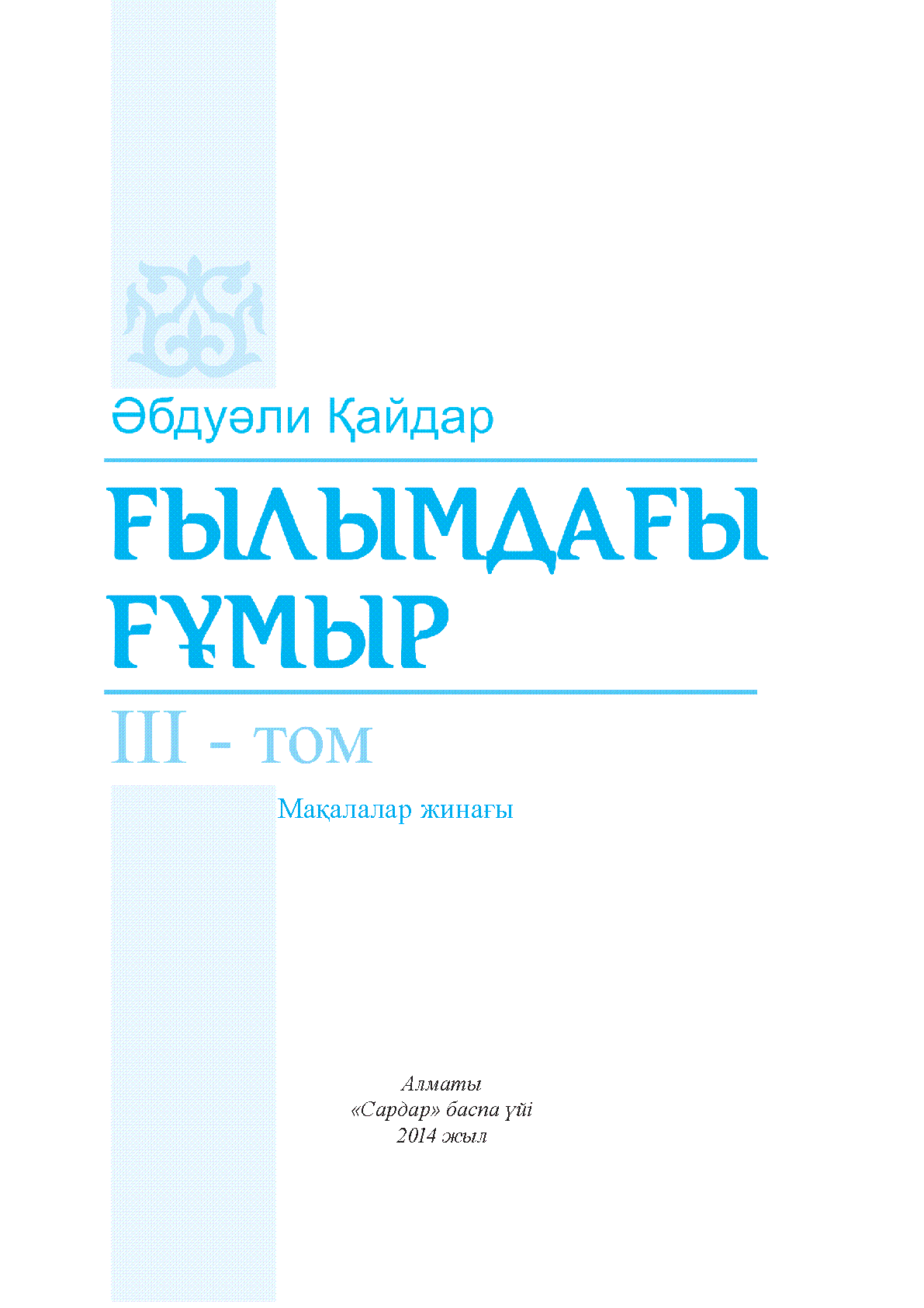 Ғылымдағы ғұмыр [Мәтін] : мақалалар жинағы / Ә. Қайдар ; [жауап. ред. Э. Ә. Өтебаева] .- Алматы : Сардар , 2014.– 4 000 дана . – 978-601-7174-42-2, 978-601-7174-45-3 (т. 3)(мұқ.) - ҚР тілдерді дамыту мен қолданудың 2011-2020 жылдарға арналған мемлекеттік бағдарламасы аясында шығарылды ; мәтіні қазақ, орыс және ұйғыр тілд. . 3 т. .– 508, [3] б., портр. . (т. 3)(мұқ.) : 1 770 тг.
